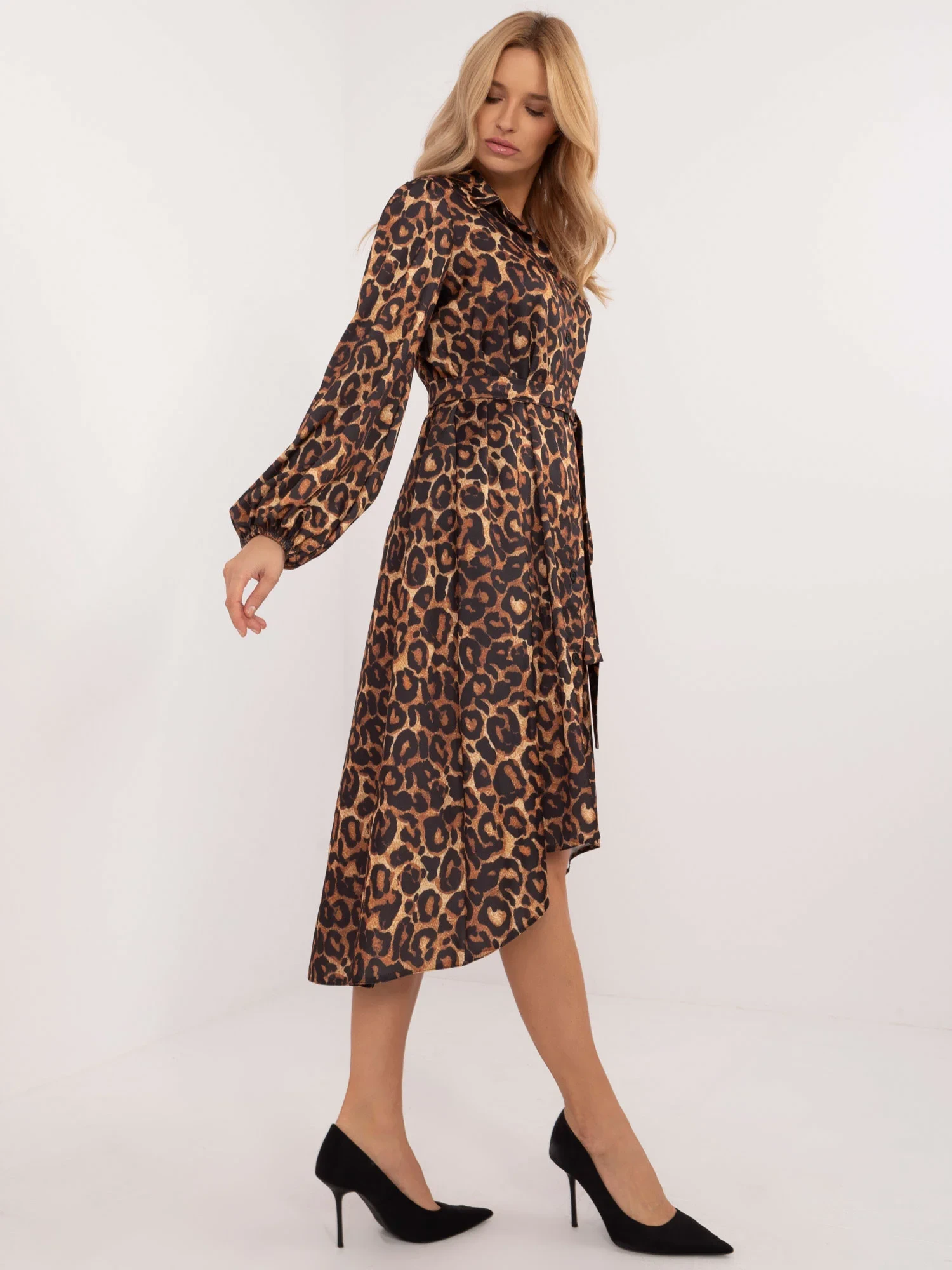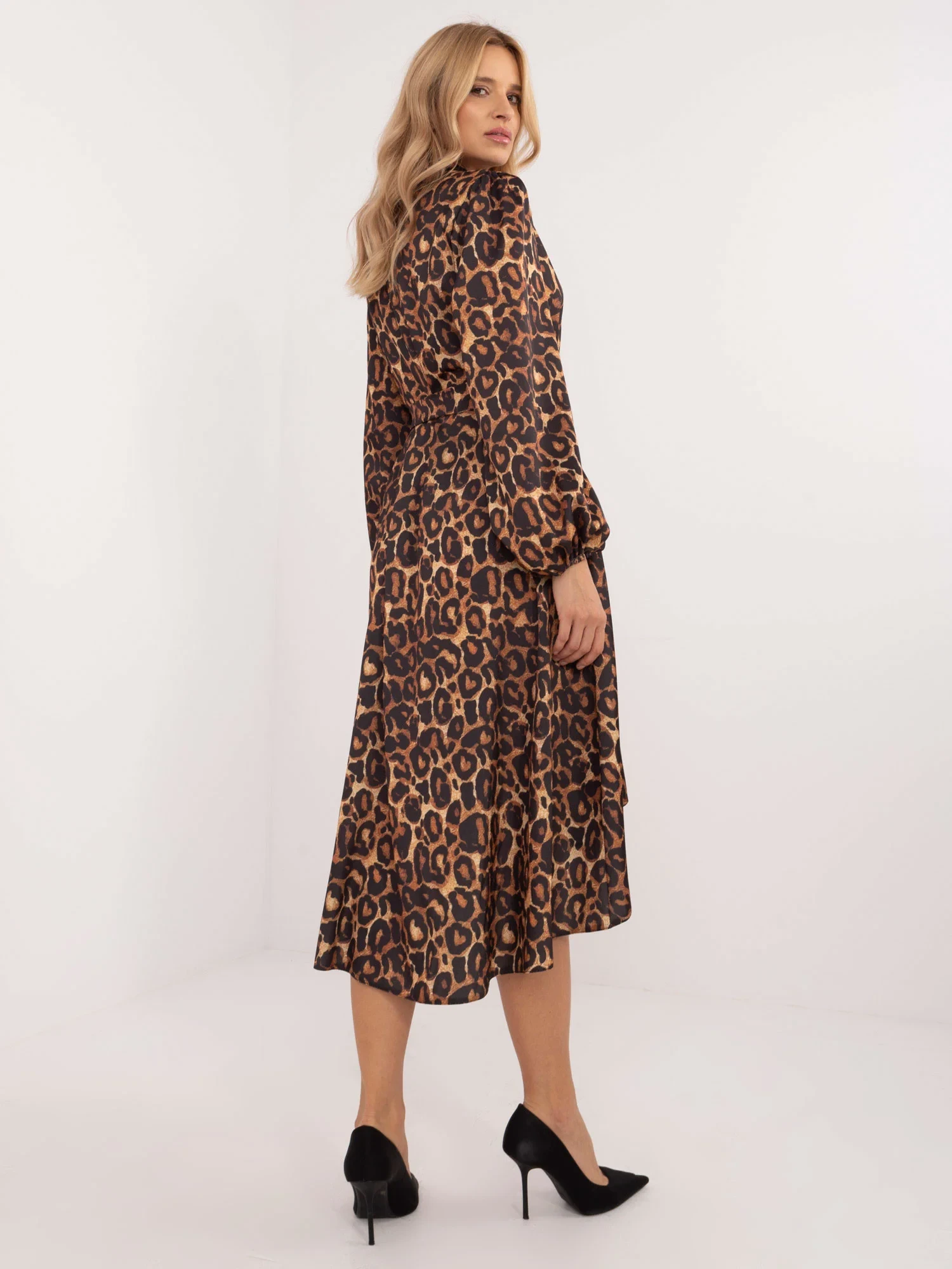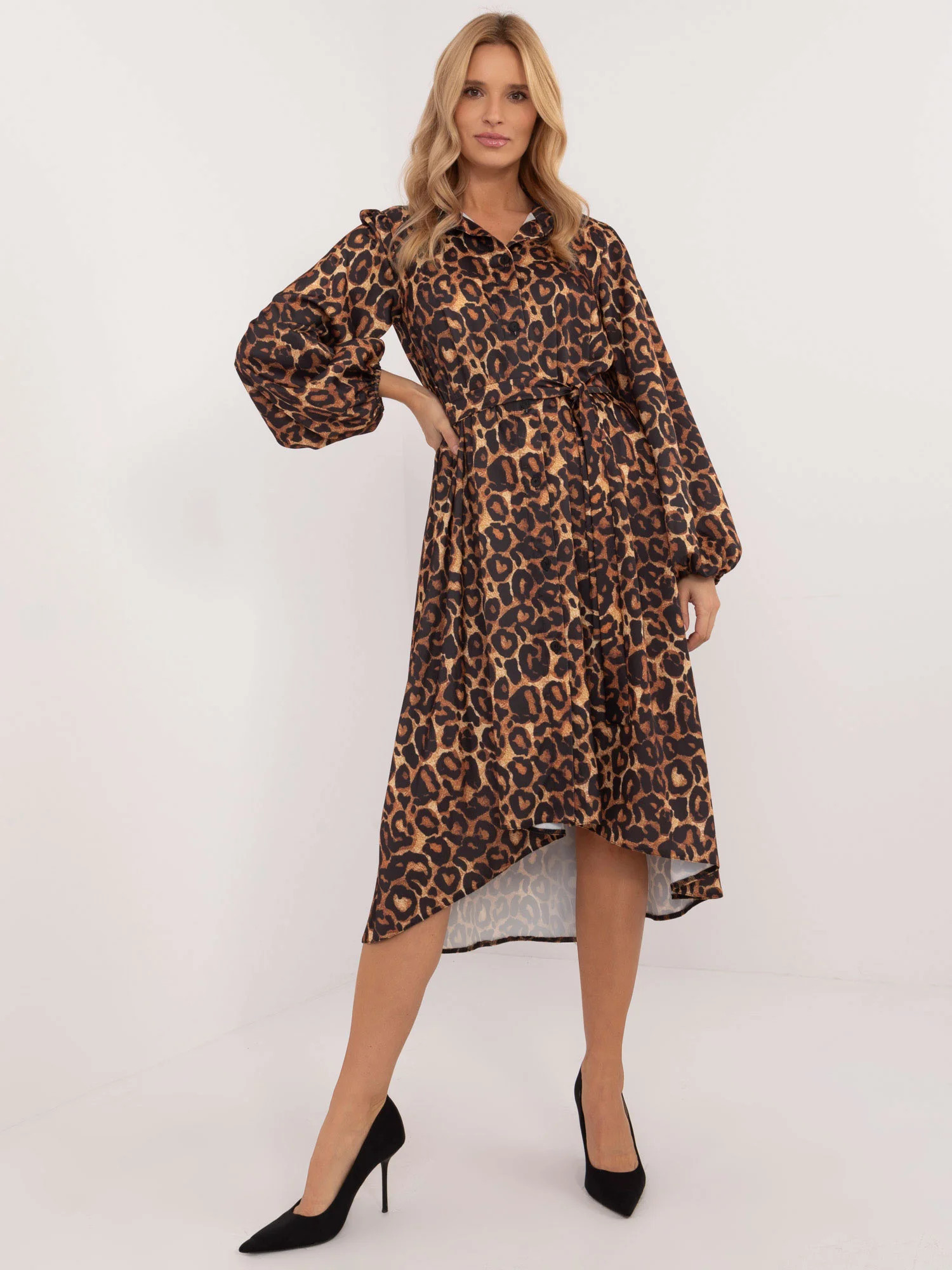 Wymiary sukienki w rozmiarze one size: szerokość pod pachami - 55 cm, długość rękawa - 58 cm, długość całkowita (przód) - 104 cm, długość całkowita (tył) - 123 cm .