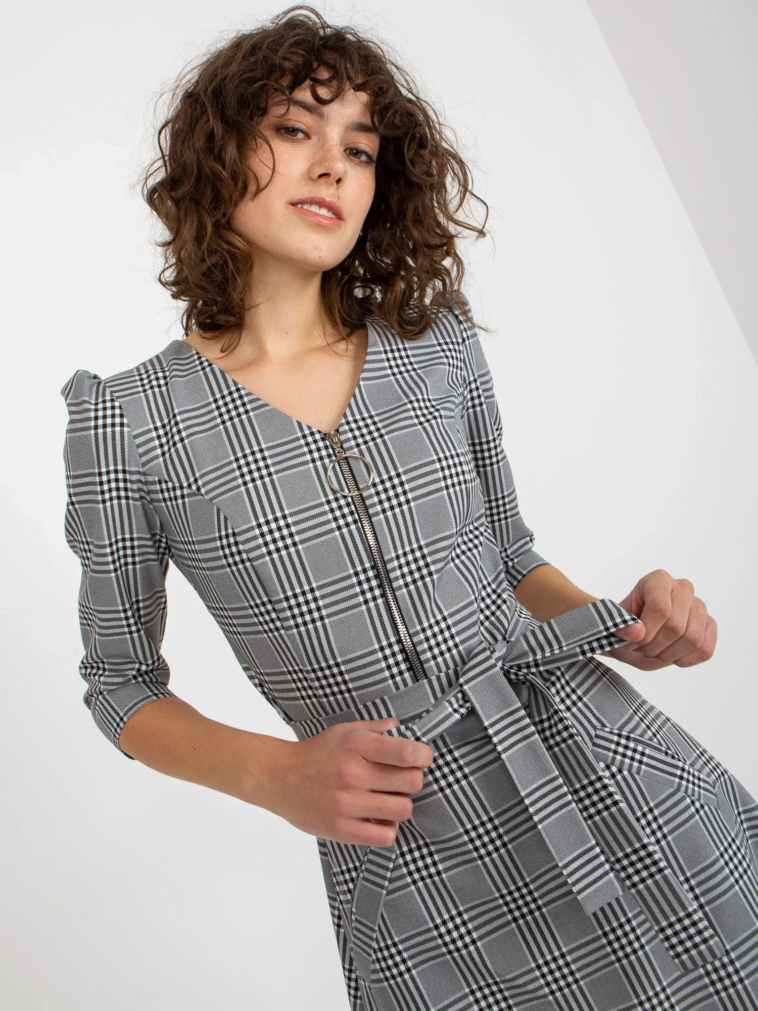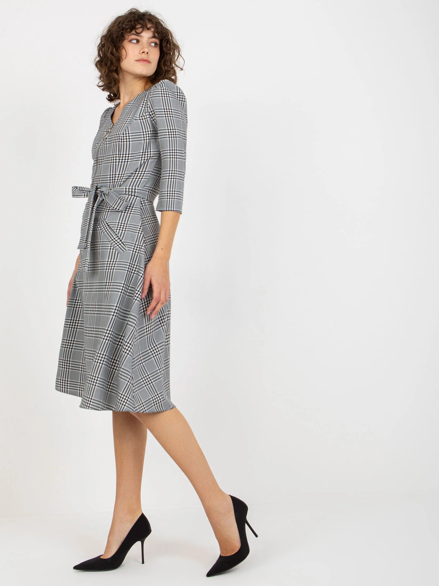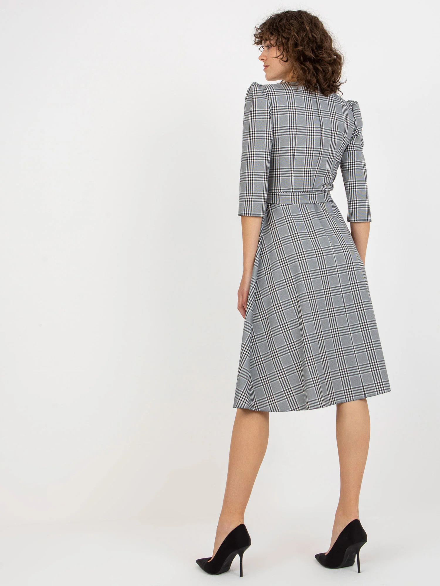 Biało-czarna midi sukienka koktajlowa w kratę z paskiem .
