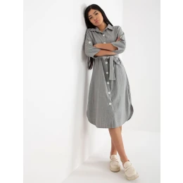 Szara koszulowa sukienka w paski z paskiem wiązanym .