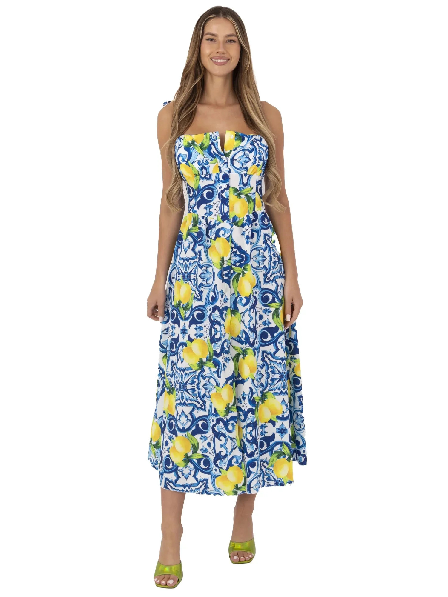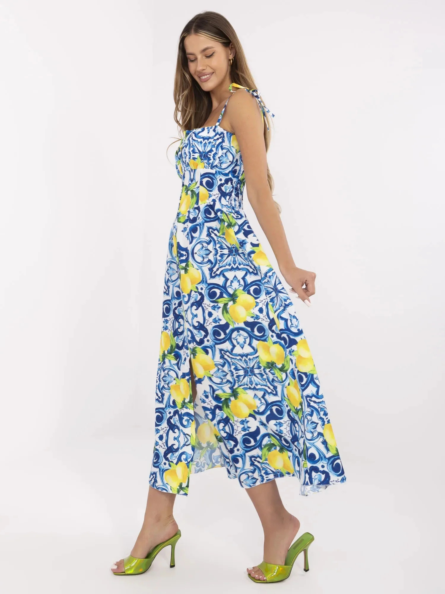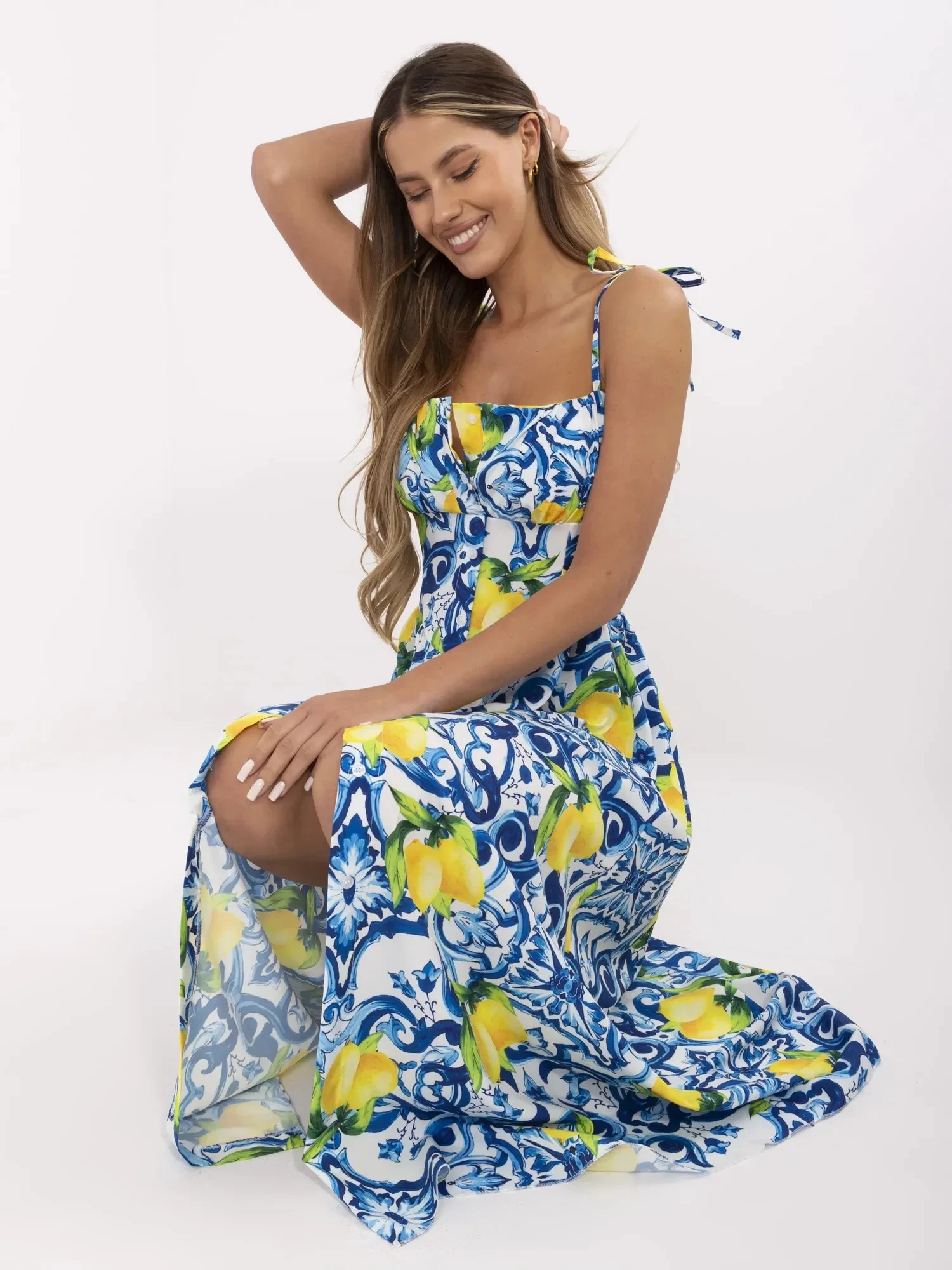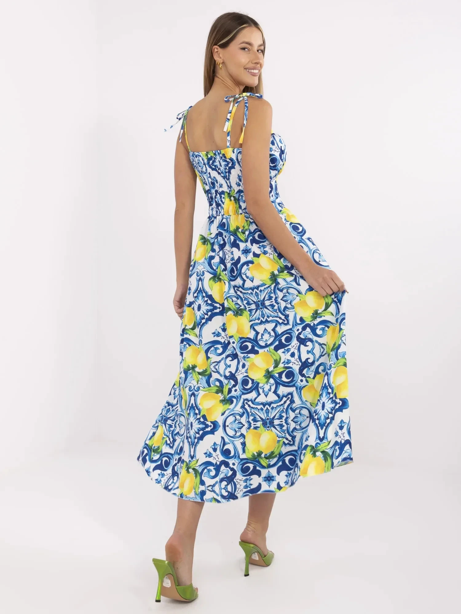 Wymiary sukienki w rozmiarze one size mierzone na płasko: szerokość pod pachami - 38 cm (na płasko), szerokość pod pachami - 52 cm (po rozciągnięciu), szerokość w talii - 34 cm, szerokość w biodrach - 59 cm, długość całkowita - 136 cm.