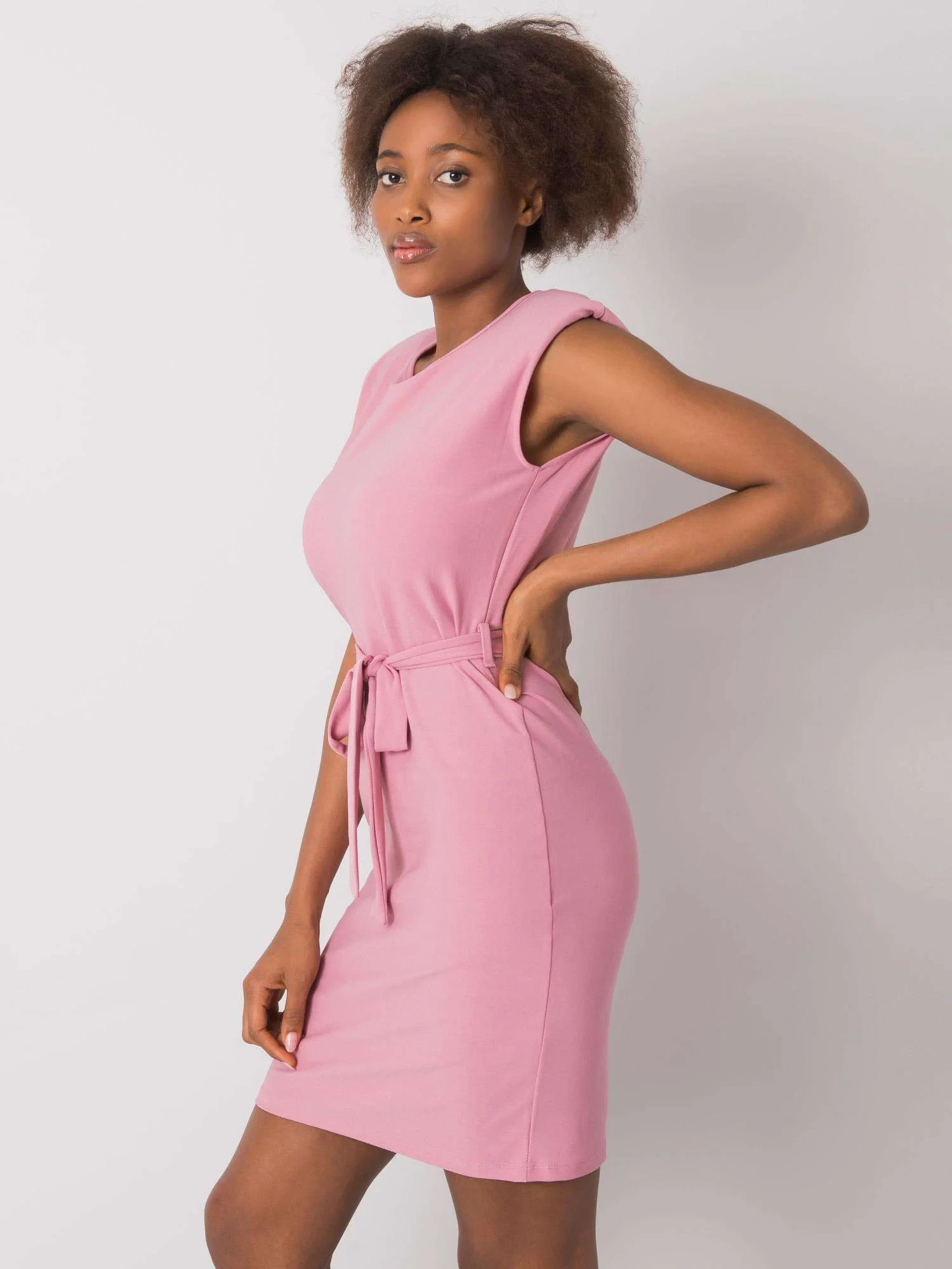 RUE PARIS Różowa damska sukienka z paskiem.