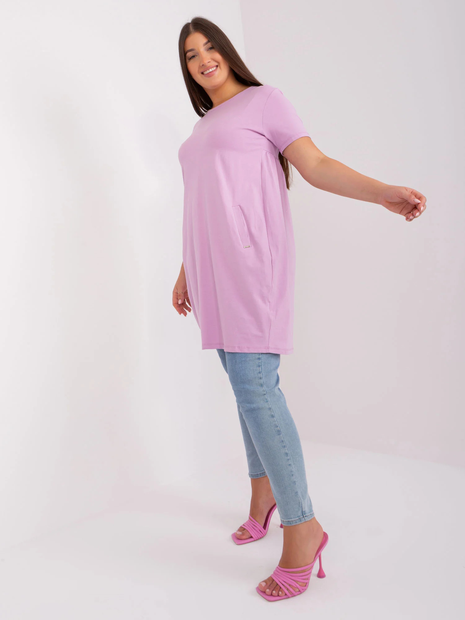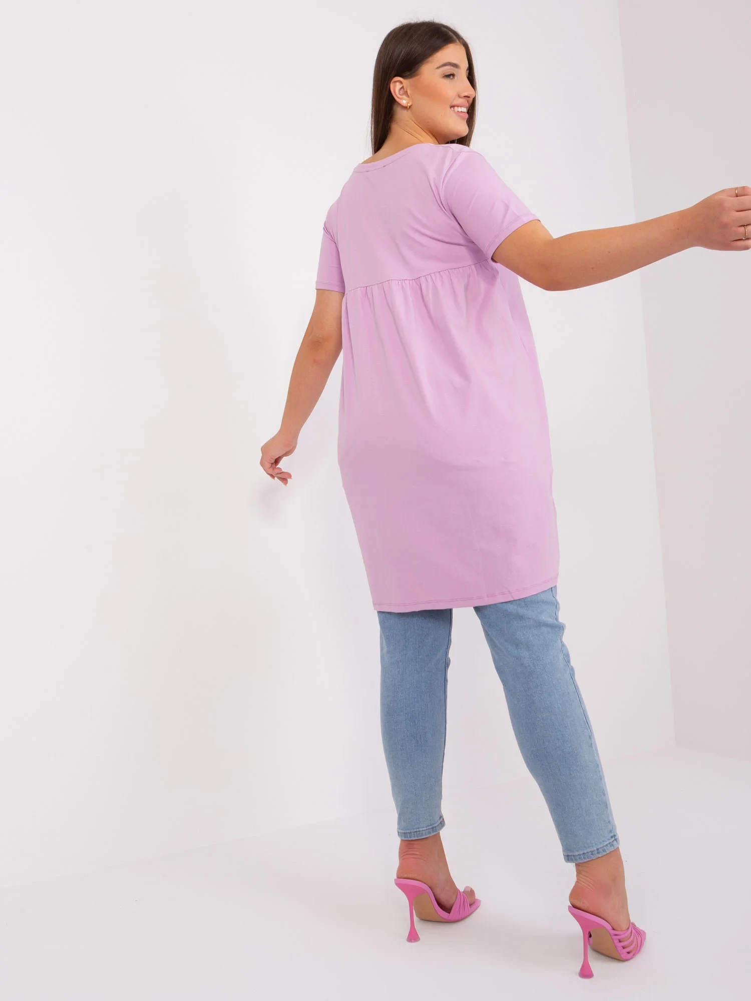 Modelka ma na sobie rozmiar one size. Wymiary modelki: wzrost 174 cm, biust 100 cm, talia 74 cm, biodra 107 cm.