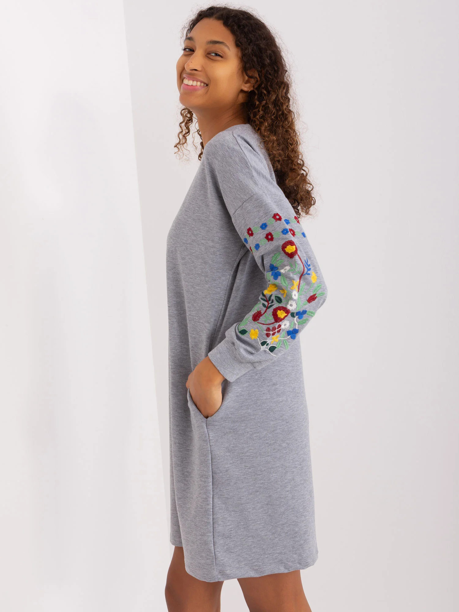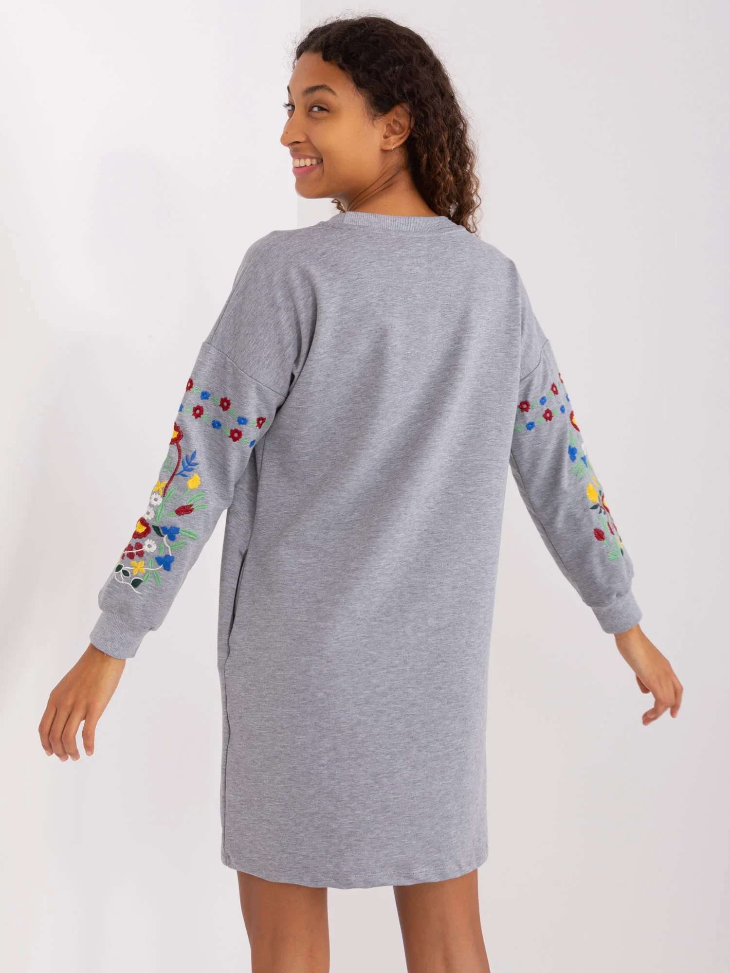 Wymiary sukienki w rozmiarze S/M mierzone na płasko: szerokość pod pachami - 56 cm, długość rękawa - 62 cm, długość całkowita - 90 cm.