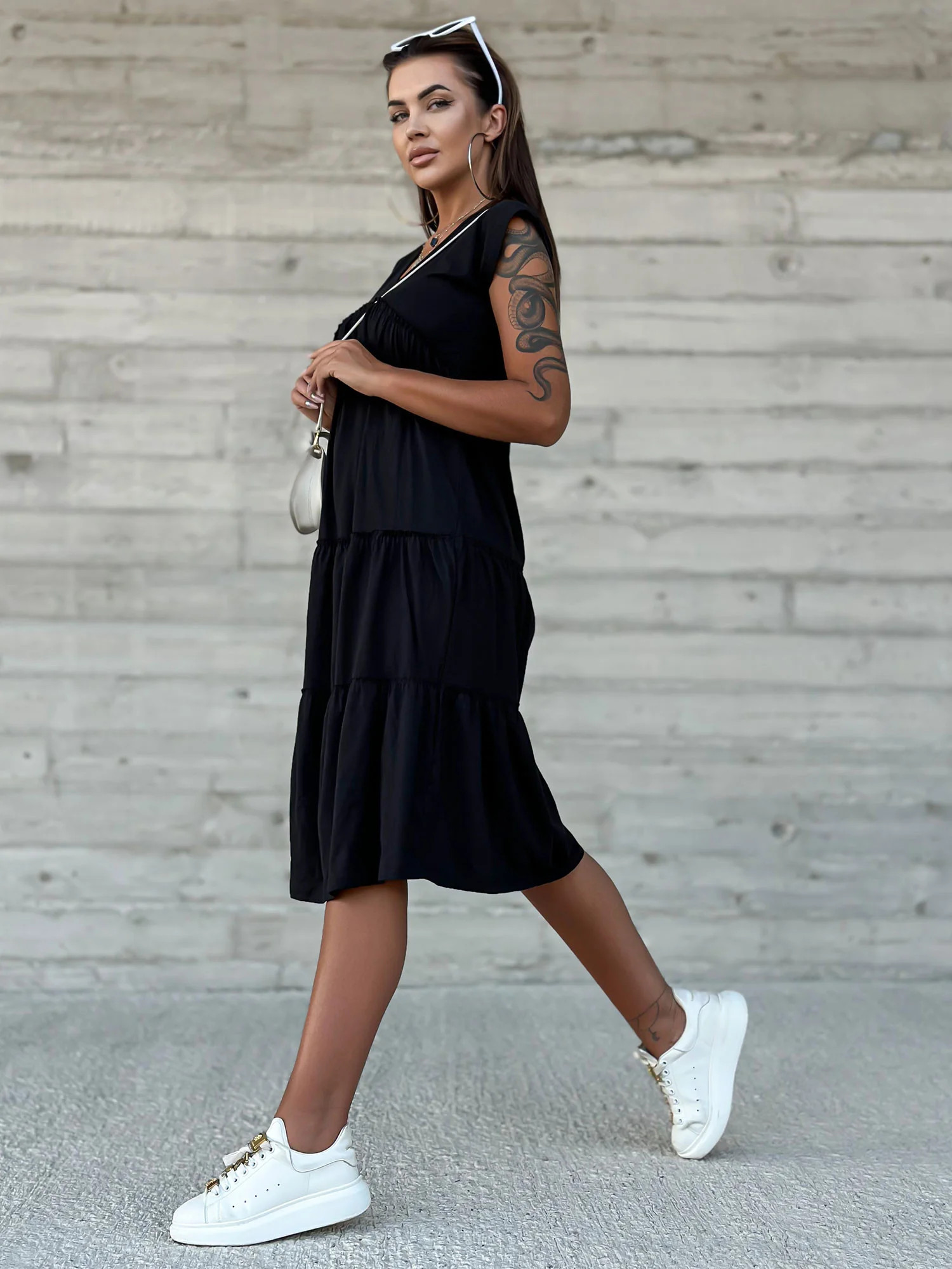 Modelka ma na sobie rozmiar S. Wymiary modelki: wzrost 179 cm, biust 93 cm, talia 67 cm, biodra 93 cm.