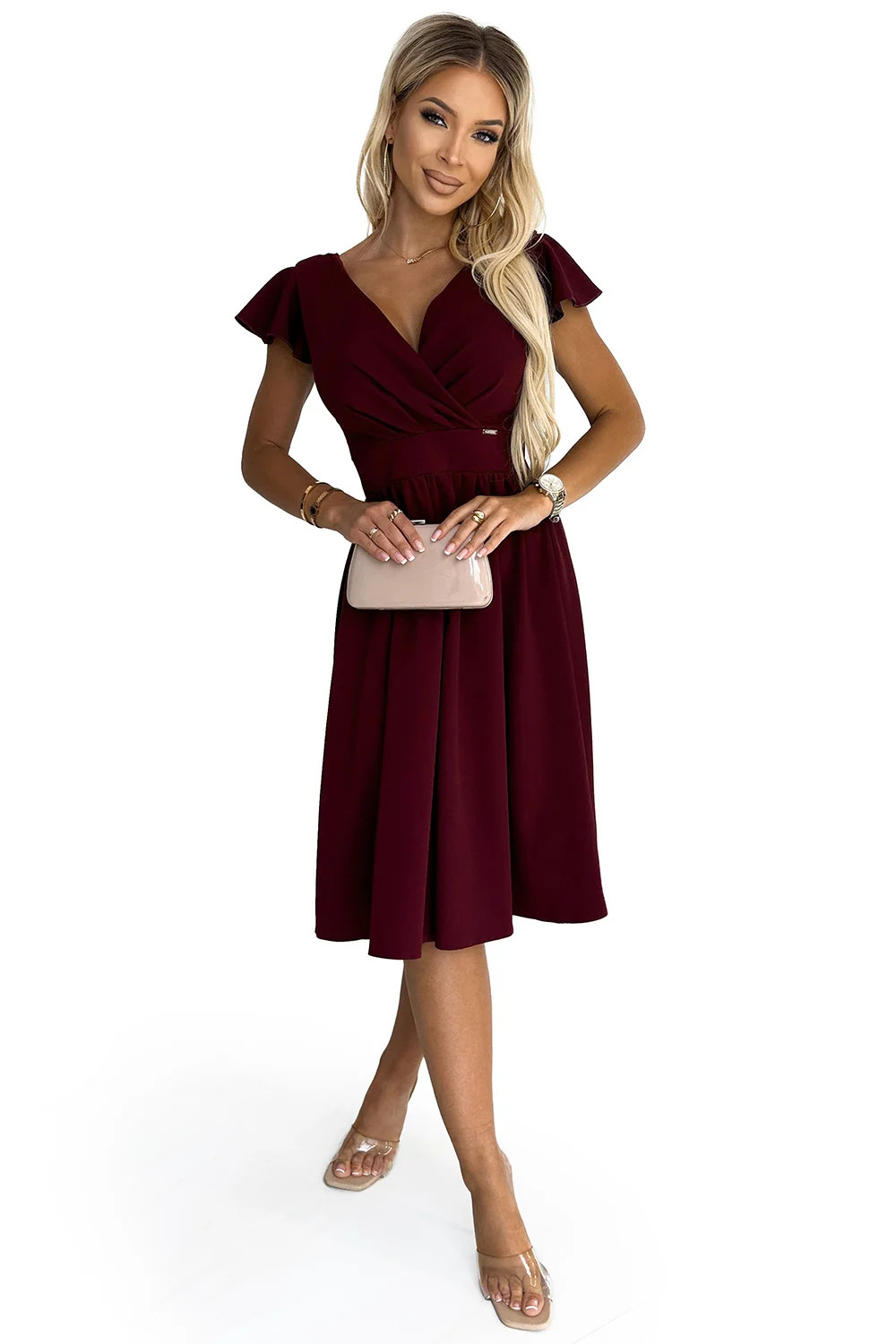 Matilde - rozkloszowana sukienka z kopertowym dekoltem i krótkim rękawkiem. Uszyta z lekko elastycznego materiału w kolorze bordowym. Marka numoco. Produkt polski.