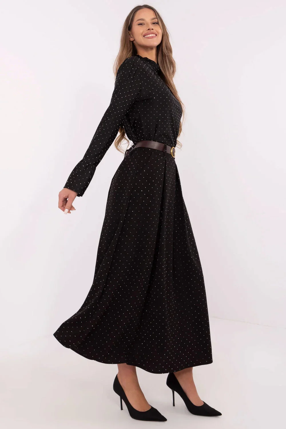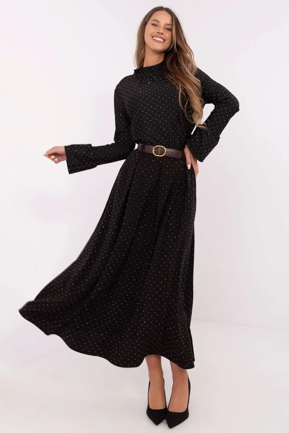 Elegantní dlouhá maxi sukně je kombinací pohodlí a rafinovaného stylu, ideální na každodenní nošení, do práce nebo na formální události. Vyrobená z vysoce kvalitní směsi polyesteru a viskózy, sukně poskytuje lehkost a pohodlí při nošení, a zároveň elegantní vzhled, který se hodí do každé situace. Na zádech v pasu je vsazena gumová pásek, který zaručuje perfektní přizpůsobení a pohodlí, zatímco zapínací pásek umožňuje nastavení a další zdůraznění pasu. Celá sukně je zdobená decentními flitry, které pokrývají celou plochu materiálu, dodávají sukně jedinečný lesk a originalitu. Navíc, vložené kapsy jsou praktickým prvkem, spojujícím funkčnost s módním vzhledem. Je to skvělý návrh pro elegantní stylizace, které se vyznačují jednoduchostí a efektním detaily. Sukně skvěle ladí jak s klasickými blůzkami, tak s odvážnými topy, nabízí nekonečné možnosti vytváření elegantních, ale pohodlných outfitů.