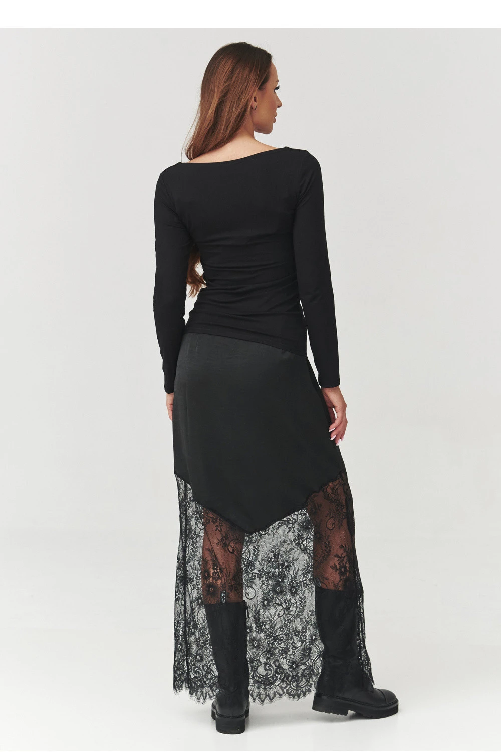 Unikátní černá sukně s krajkovým lemem je návrh pro ženy, které rády spojují eleganci s trochou charakteru. Tento model ohromuje originálním střihem, hladký jemně asymetrický vrch z lehkého polyesteru jemně kontrastuje s efektní krajkou vytvářející jedinečné spojení faktur a stylů. Sukně krásně padne do pohybu a průhledná krajka dodává celku ženský, smyslný akcent. Skvěle se hodí jak do večerních stylizací, tak do každodenních s botami, kozačkami nebo těžší obuví pro módní, lehce rockový efekt. Vyrobeno v Itálii.