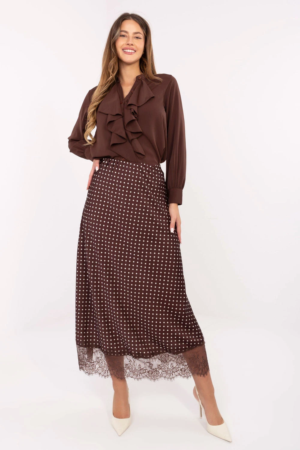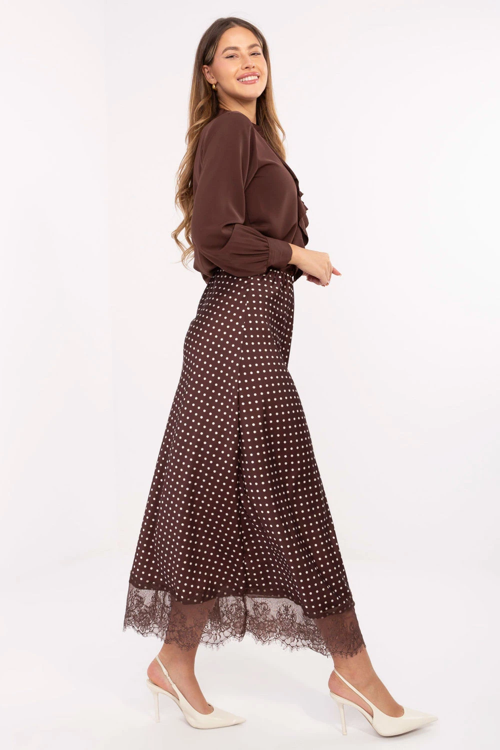 Elegantní a ženská sukně midi délky vyrobena z příjemného na dotek materiálu, polyesteru s přídavkem elastanu, který zajistí pohodlí a ideální přizpůsobení siluetě. Model je zdoben jemnou krajkou dole, co mu dodává eleganci a jemný charakter. V pasu je vsazena elastická guma, díky čemuž se sukně perfektně přizpůsobí pasu a není nutné ji zapínat. Materiál zdobí módní puntíkovaný vzor, který dodává celku lehkost a šarm. Jedná se o univerzální model, který se hodí jak na každý den, do práce, tak i na slavnostní příležitosti.