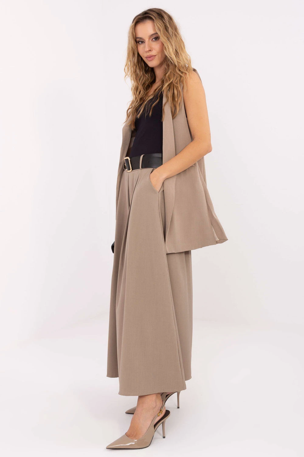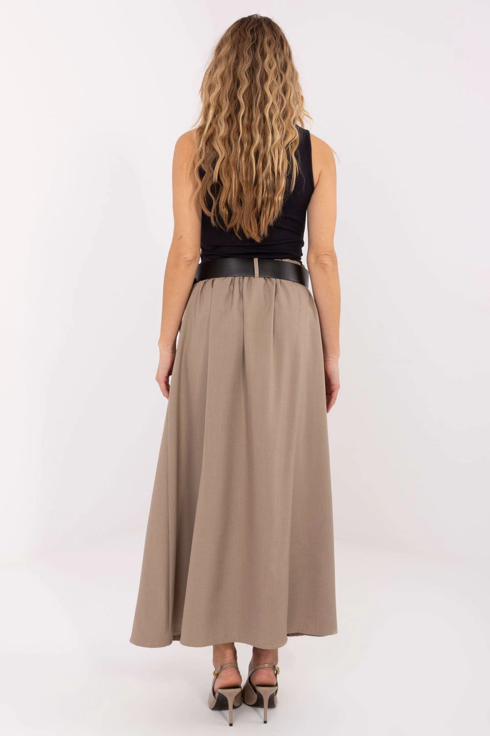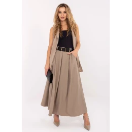 Elegantní a ženská dlouhá rozkročená maxi sukně s kontrafaldami vpředu, kombinující pohodlí nošení s klasickým stylem vhodným jak do práce, tak na každodenní vycházky. Vyrobená z vysoce kvalitní směsi viskózy a polyesteru, je lehká, prodyšná a krásně padne na postavě. Model má vsazený gumový pás vzadu, který zajistí ideální přizpůsobení v pasu, a zapínací pásek, který jemně zdůrazní postavu. Boční kapsy zvyšují funkčnost a kontrafaldy vpředu dodávají sukni elegantní, rozkročený tvar. Sukně má hladký vzor, chybí klasické zapínání a maxi délka, čímž je univerzální a snadno se stylizuje. Je to ideální volba na každodenní, návštěvní a elegantní příležitosti, kombinující pohodlí s nadčasovým střihem.