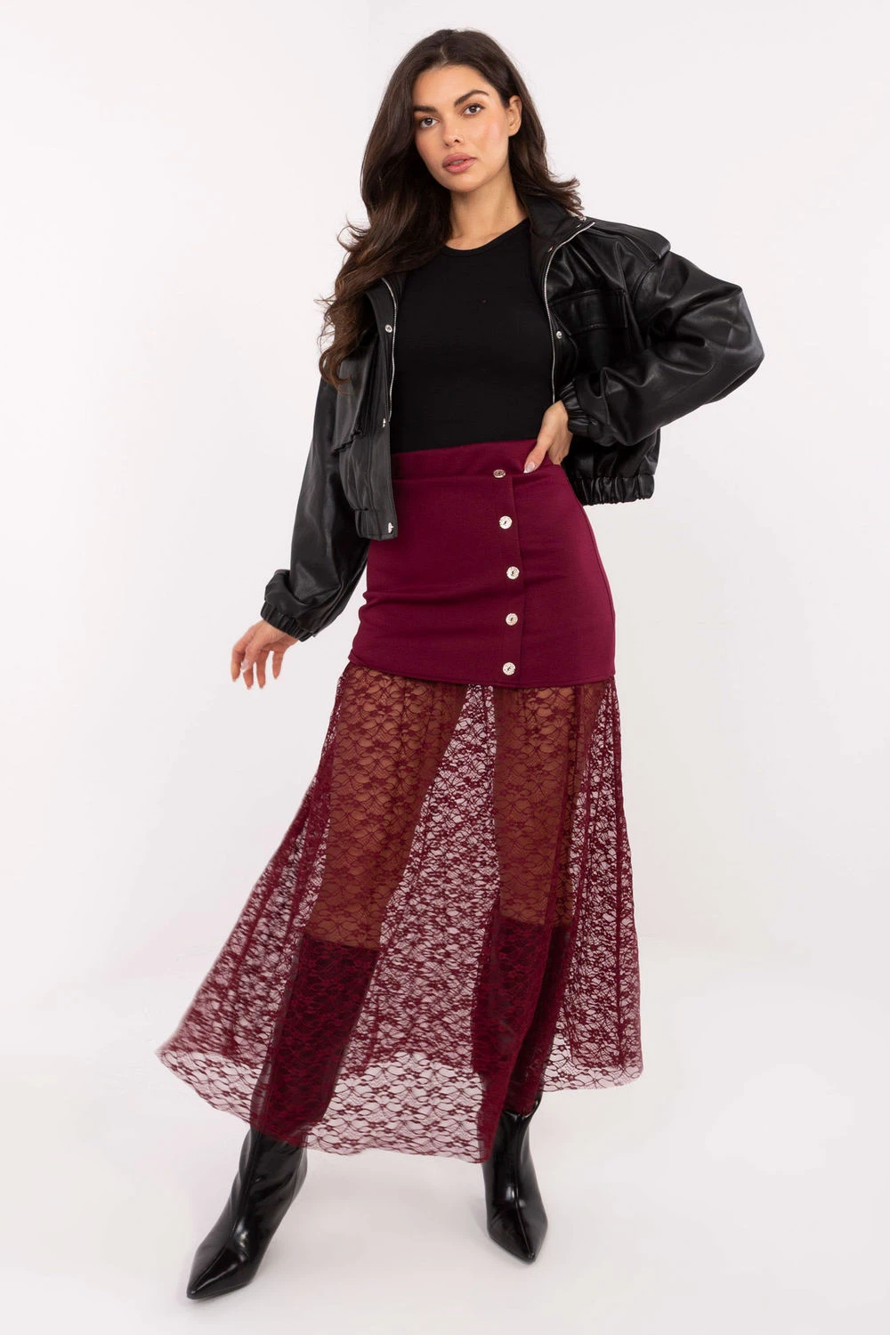Sukně z materiálu mini s krajkovým vložením je stylovým návrhem s ležérním charakterem, ideálním na každodenní příležitosti. Model kombinuje klasický střih s moderními detaily, vytvářející lehký, ženský efekt. Sukně je mini délky, kterou prodlužuje přišitá krajková tkanina až do délky midi, přidávající lehkost a jemnou dekorativitu. Různorodá struktura materiálu dodává celku výraz a módní charakter. Vyrobená z kombinace viskózy, nylonu a elastanu, je příjemná na dotek, elastická a pohodlná na nošení. V pasu vsazená guma zajišťuje pohodlí a ideální přizpůsobení, a ozdobné knoflíky na přední straně plní dekorativní roli, zdůrazňující styl sukně. Model nemá zapínání, což zdůrazňuje jeho volný, ležérní charakter a usnadňuje rychlé oblékání. Je to skvělá volba pro každodenní outfit, kdy chcete vypadat módně a žensky.