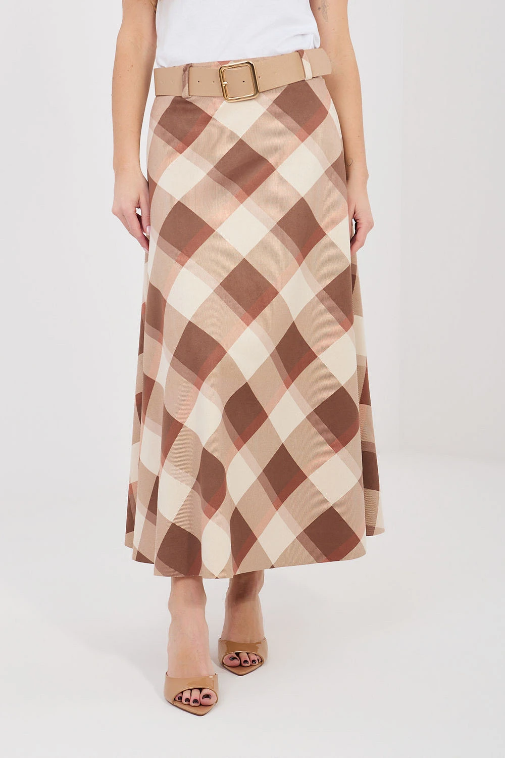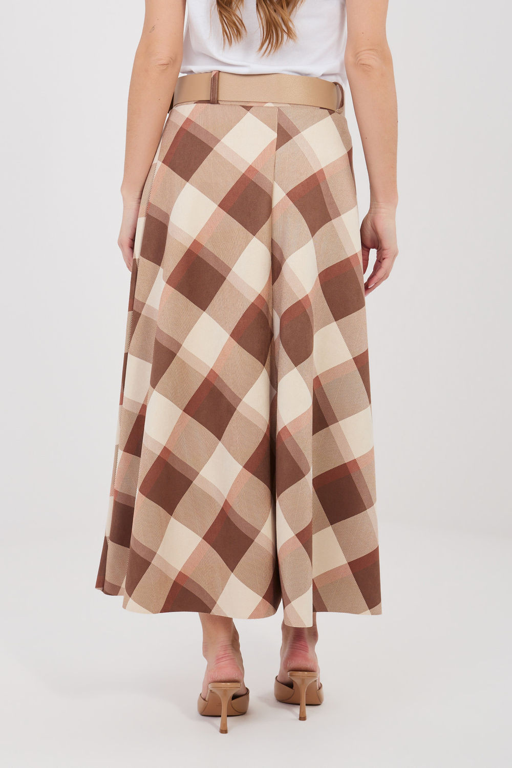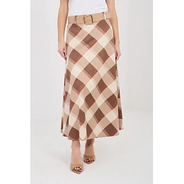 Elegantní maxi sukně s rozšířeným střihem, která se skvěle hodí jak do každodenních stylizací, tak do pracovních outfitů. Model vyniká klasickým károvaným vzorem, který celku dodává elegantní a nadčasový charakter. Sukně má pohodlný gumový pas, díky kterému se dobře přizpůsobí postavě a poskytuje pohodlí během celého dne. Dalším prvkem je zapínací pásek, který zdůrazňuje pas a je stylovým doplňkem modelu. Délka maxi a rozšířený střih skvěle padnou při pohybu, dodávají lehkost a ženský charakter outfitu. Vyrobená z materiálu kombinujícího polyester a elastan, je odolná, lehce elastická a pohodlná na nošení. Model bez zapínání zajišťuje rychlé a snadné oblékání.