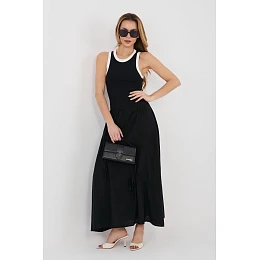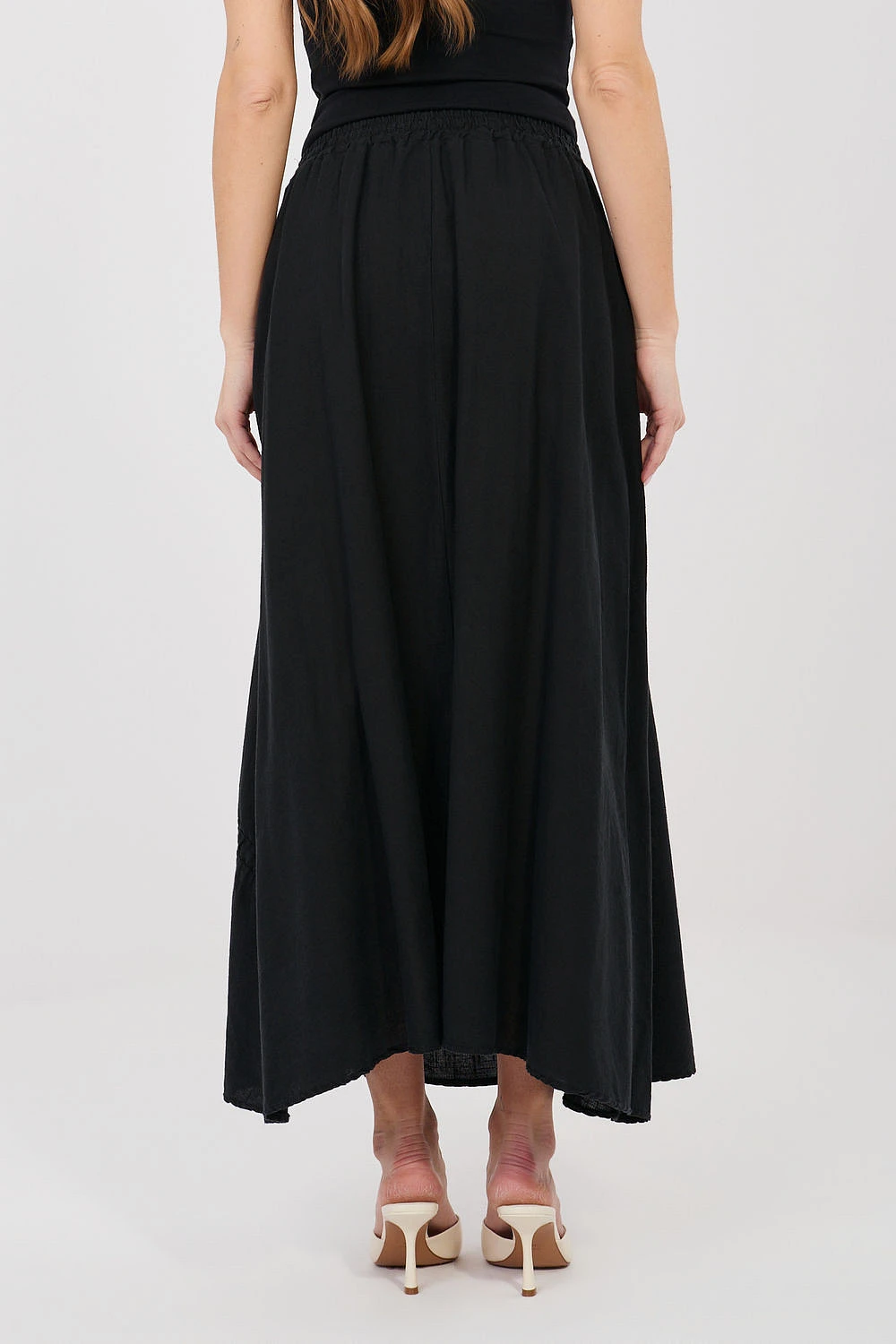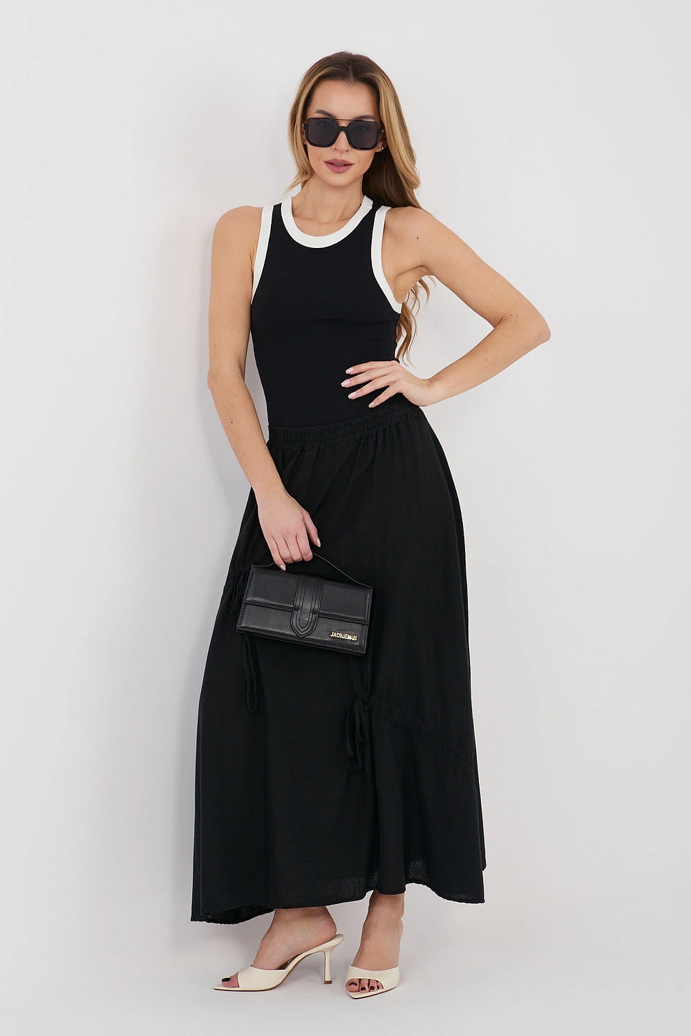 Dlouhá dámská sukně v casual stylu, ideální pro každodenní outfit. Její hladký vzor ji činí univerzální a snadno kombinovatelnou s různými kousky oblečení, od lehkých blůz po klasické košile nebo topy. Model je vyroben z vysoké kvality směsi lyocellu, bavlny a lnu, díky čemuž je materiál lehký, prodyšný a příjemný na nošení. Přírodní vlákna zajišťují, že sukně je skvělá zejména v teplejších dnech, poskytující pohodlí po celý den. Sukně má elastický pásek, který zajistí pohodlné přizpůsobení se postavě a volnost pohybu. Chybí klasické zapínání, což znamená, že model je snadný a rychlý na oblékání. Ozdobné vázání vpředu dodává celku decentní, ženský charakter a tvoří stylový akcent dokončení.