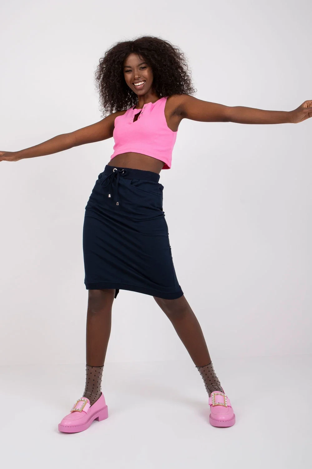 Mikinová sukně s pružným pasem a vázačkami. Sukně má nakládané kapsy.