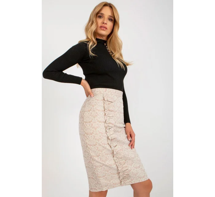 Elegantní tužková sukně s vyšším pasem, zapínaná na krytý zip. Sukně ze zajímavě strukturované látky s podšívkou, na přední straně ozdobný volán.