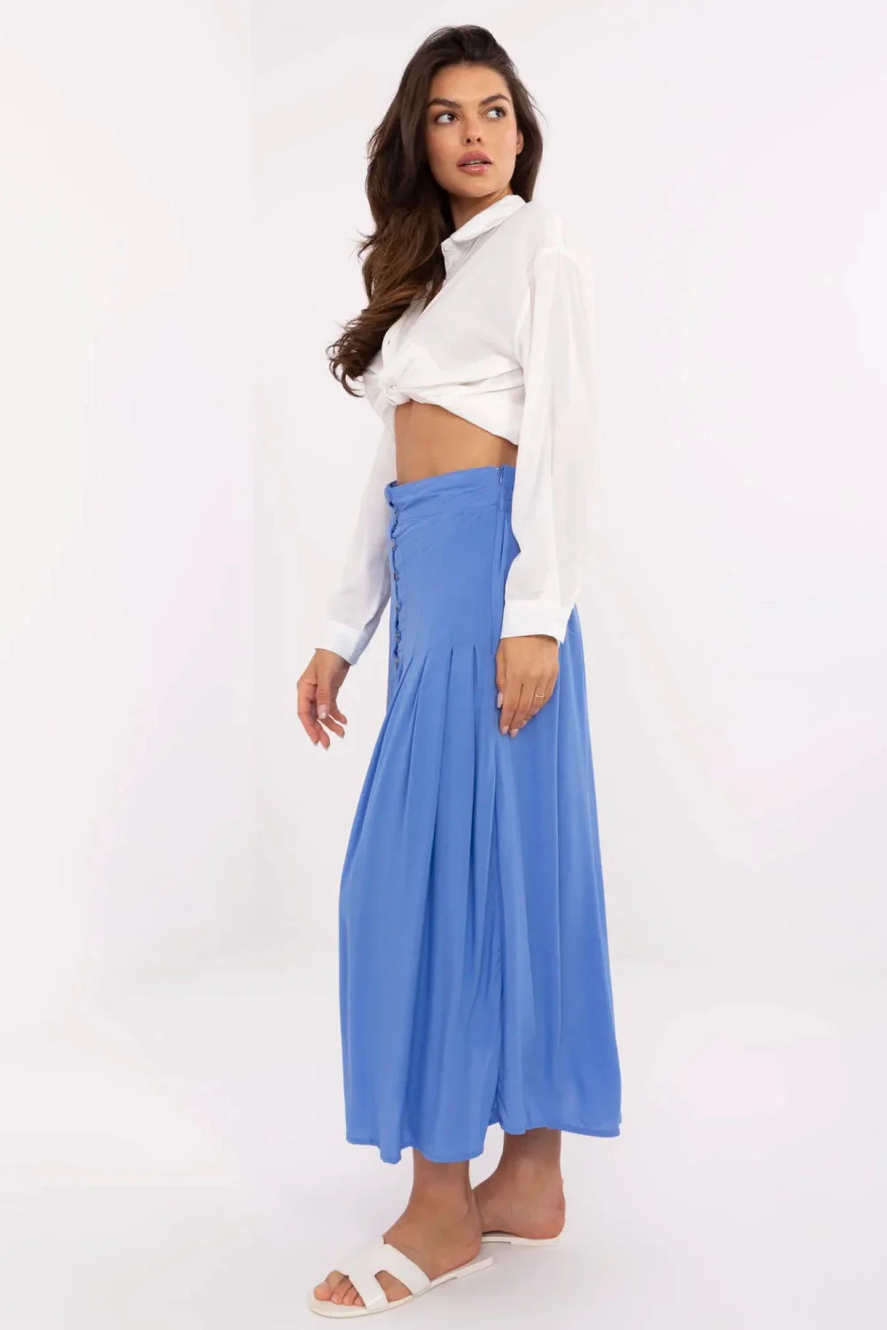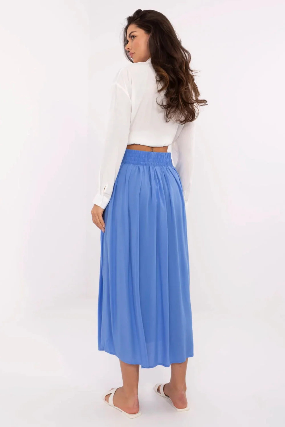 Elegantní, plisovaná midi sukně je skvělým návrhem na každý den i do práce. Vyrobená z ekologické viskózy spojuje módní vzhled s pohodlím nošení a ohleduplností k životnímu prostředí. Model s hladkým dokončením a ozdobnými knoflíky vpředu vypadá elegantně a moderně. Plisování dodává lehkost a elastický pásek na zádech zajistí pohodlné přizpůsobení se postavě. Skrytý zip na boku usnadňuje oblékání a neporušuje linie střihu. Jedná se o univerzální a ženskou sukni, která se skvěle hodí do každodenních i pracovních stylizací.