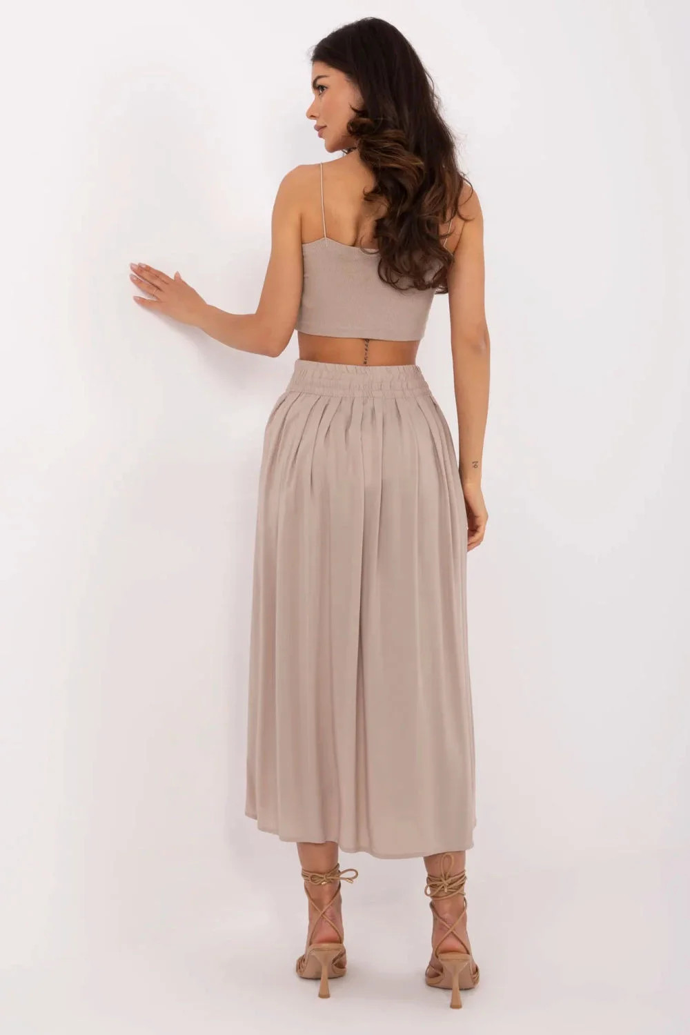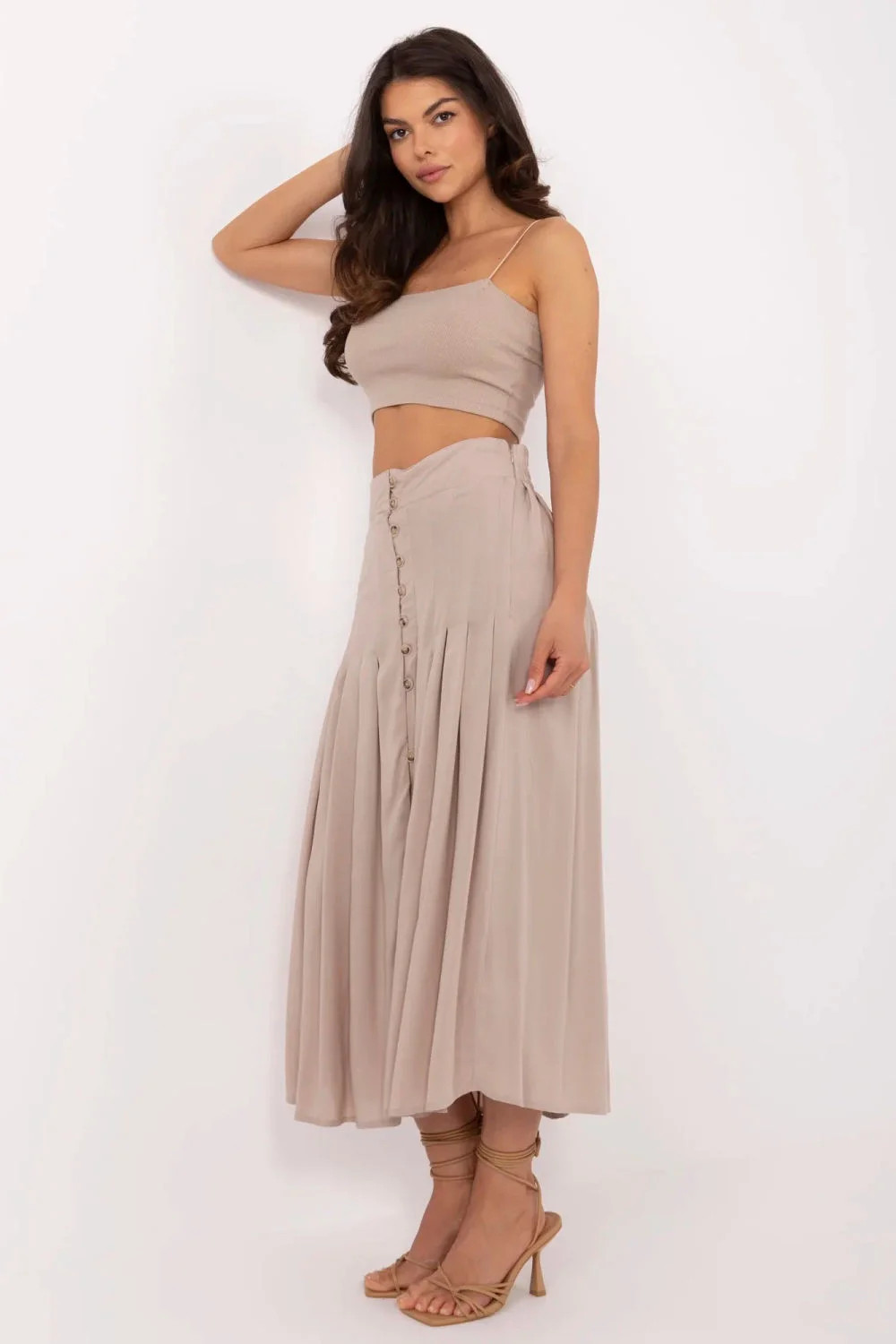 Elegantní, plisovaná sukně midi délky je skvělý návrh pro každodenní nošení i do práce. Vyrobená z ekologické viskózy spojuje módní vzhled s pohodlím nošení a ohleduplností k životnímu prostředí. Model s hladkým zpracováním a ozdobnými knoflíky na přední straně vypadá elegantně a moderně. Plisování dodává lehkosti a elastický pásek se vsazenou gumou na zadní straně zajišťuje pohodlné přizpůsobení siluetě. Skrytý zip na boku usnadňuje oblékání a neničí linie střihu. Jedná se o univerzální a ženskou sukně, která se skvěle hodí do volných i kancelářských stylizací.