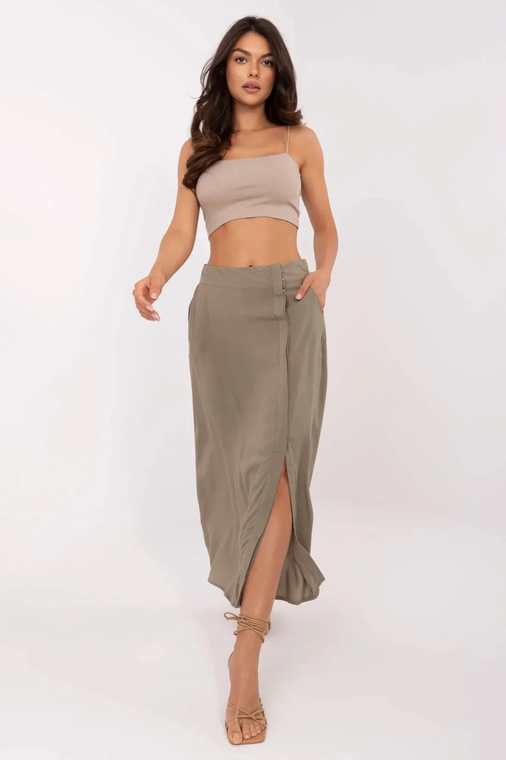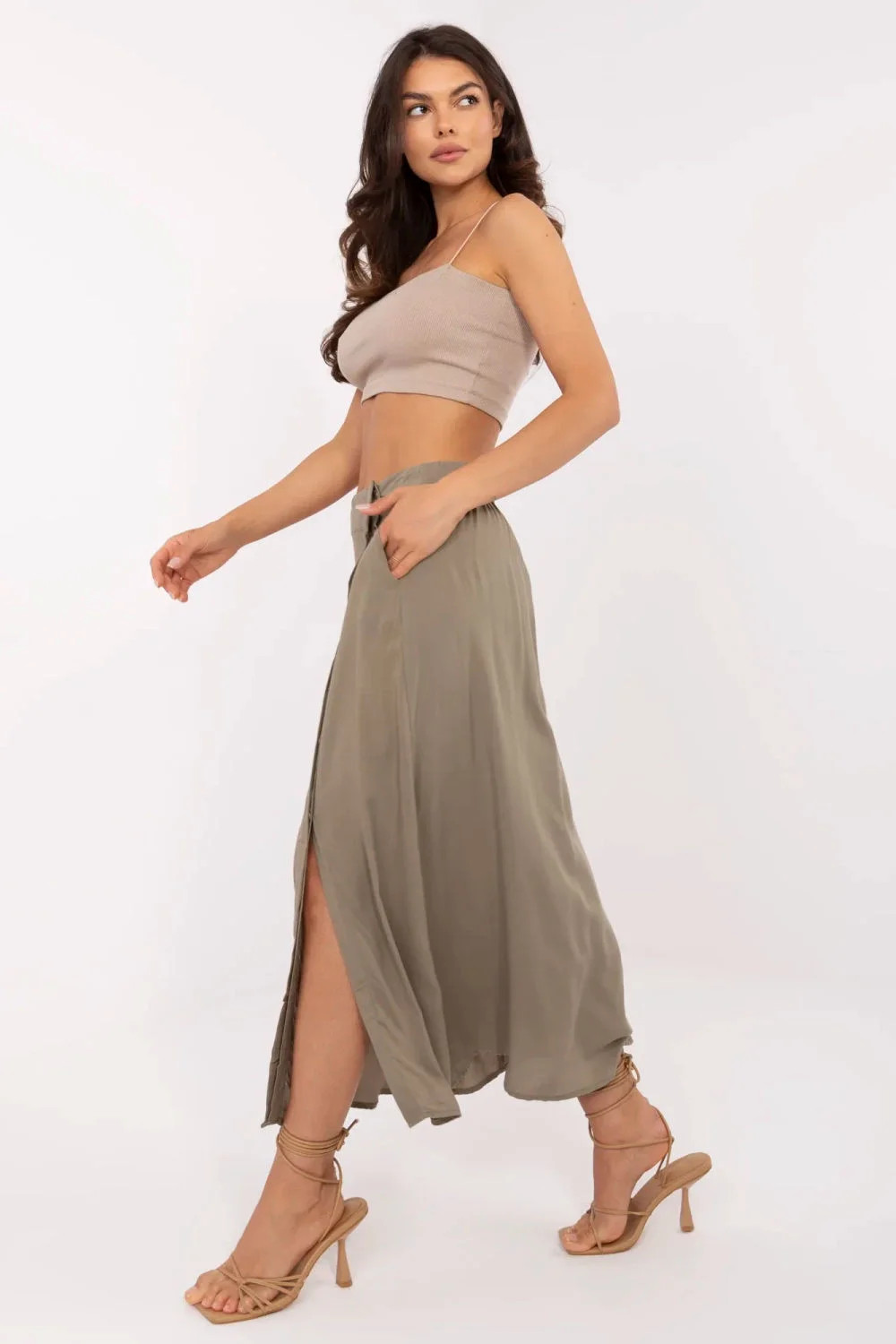 Elegantní a zároveň pohodlná dámská sukně midi délky je skvělou volbou na každý den i do práce. V casual stylu se skvěle hodí jak do kanceláře, tak i na každodenní vycházky. Vyrobená z převažující viskózy, přátelské kůži a prodyšné látky, zaručuje pohodlí nošení po celý den. Hladký, jednolitý vzor zdůrazňuje minimalistický a moderní charakter sukně, činíce ji univerzálním prvkem šatníku. Model má praktické kapsy a zapínání na knoflíky s krytou lištou, co dodává celku eleganci a uklizený vzhled. Další výhodou je skutečnost, že sukně patří do kolekce ekologického oblečení, ideální pro ty, kteří dbají na životní prostředí a volí uvědomělou módu. Jedná se o nadčasový střih, který snadno sladíte s různými stylizacemi, od klasických košil po volné trička.