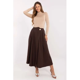 Tato elegantní midi sukně je ideální kombinací klasiky a pohodlí, skvělá na každý den, do práce nebo na formální události. Vyrobená z vysoce kvalitní směsi polyesteru a elastanu poskytuje pohodlí nošení, odolnost a krásné padání materiálu. Model s hladkou strukturou se vyznačuje plisovaným předním dílem, který dodává lehkost a ženský charakter. Na zádech je vsazena gumová vložka, díky které se sukně perfektně přizpůsobí postavě a poskytuje pohodlí po celý den. Další výhodou jsou boční kapsy a ozdobný knoflík, jemně zdůrazňující elegantní styl modelu. Absence zapínání činí sukně mimořádně praktickou a snadnou na oblékání. Jedná se o univerzální kousek šatníku, který se skvěle hodí jak do kancelářských outfitů, tak i na setkání ve formálnějším duchu.
