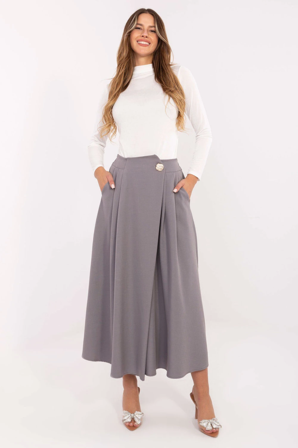 Tato elegantní midi sukně je ideální kombinací klasiky a pohodlí, skvělá na každý den, do práce nebo na formální události. Vyrobená z vysoké kvality polyesteru a elastanu, poskytuje pohodlí nošení, odolnost a krásné uspořádání materiálu. Model s hladkou strukturou se vyznačuje plisovaným předním dílem, který dodává lehkost a ženský charakter. Na zadní straně je vsazena guma, díky které se sukně ideálně přizpůsobuje postavě a poskytuje pohodlí po celý den. Další výhodou jsou boční kapsy a ozdobné knoflíky, jemně zdůrazňující elegantní styl modelu. Bez zapínání je sukně mimořádně praktická a snadno se obléká. Jedná se o univerzální kus šatníku, který se skvěle hodí jak do kancelářských stylizací, tak i na formální setkání.
