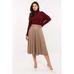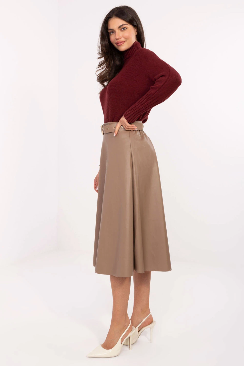Elegantní sukně vyrobená z vysoce kvalitní ekokože je ideální volbou pro ženy, které ocení eleganci a pohodlí. Model midi délky skvěle zdůrazňuje postavu a hladká struktura materiálu dodává celku klasický, nadčasový charakter. Guma vsazená vzadu v pase zajistí ideální přizpůsobení a pohodlí nošení, zatímco zapínací pásek decentně zdůrazní pas. Bez zapínání je sukně velmi pohodlná při oblékání a nošení. Vyrobená z kombinace polyesteru a polyuretanu zaručuje trvanlivost a efektní vzhled připomínající přírodní kůži. Tento model se skvěle hodí na každý den i do práce, vytvářejíc elegantní stylizace s košilí, svetrem nebo přiléhavým sakem.