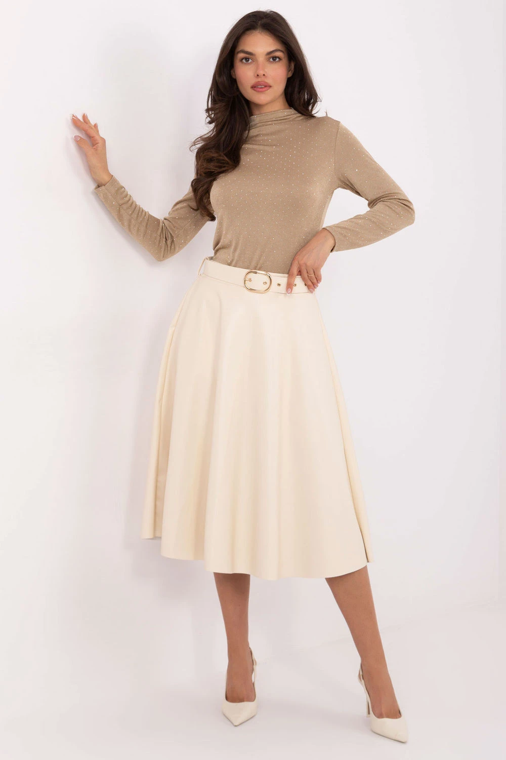 Elegantní sukně vyrobená z vysoce kvalitní ekokože je ideální volbou pro ženy, které ocení eleganci a pohodlí. Model midi skvěle zdůrazňuje postavu a hladká faktura materiálu dodává celku klasický, nadčasový charakter. Guma vsazená v pasu zajišťuje perfektní přizpůsobení a pohodlí při nošení, zatímco zapínací pásek decentně zdůrazňuje pas. Bez zapínání je sukně mimořádně pohodlná na oblékání a nošení. Vyrobená z kombinace polyesteru a polyuretanu zaručuje trvanlivost a efektní vzhled připomínající přírodní kůži. Tento model se skvěle hodí na každý den i do práce, vytvářejíc elegantní styly s košilí, rolákem nebo přizpůsobeným saka.