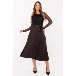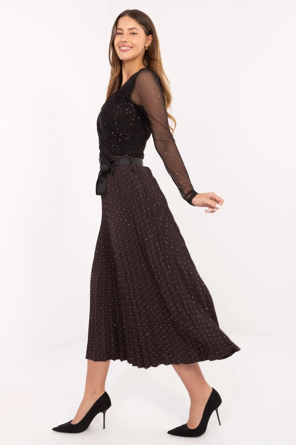 Elegantní a ženská plisovaná midi sukně vyrobená z vysoce kvalitní viskózy s přídavkem elastanu, která poskytuje lehkost, prodyšnost a pohodlí při nošení. Model má elastický pásek v pasu, díky čemuž se skvěle přizpůsobuje postavě a nepotřebuje se zapínat. Další výhodou je pásek ve formě šátku k zavázání, který pomáhá zdůraznit pas a dodává outfitu elegantní charakter. Celý materiál zdobí lesklé flitry, které jemně odrážejí světlo a dodávají sukní jedinečné kouzlo a eleganci. Je to skvělý návrh na slavnostní události, rodinná setkání nebo elegantní výlety vždy, kdy chcete vypadat stylizovaně a elegantně.