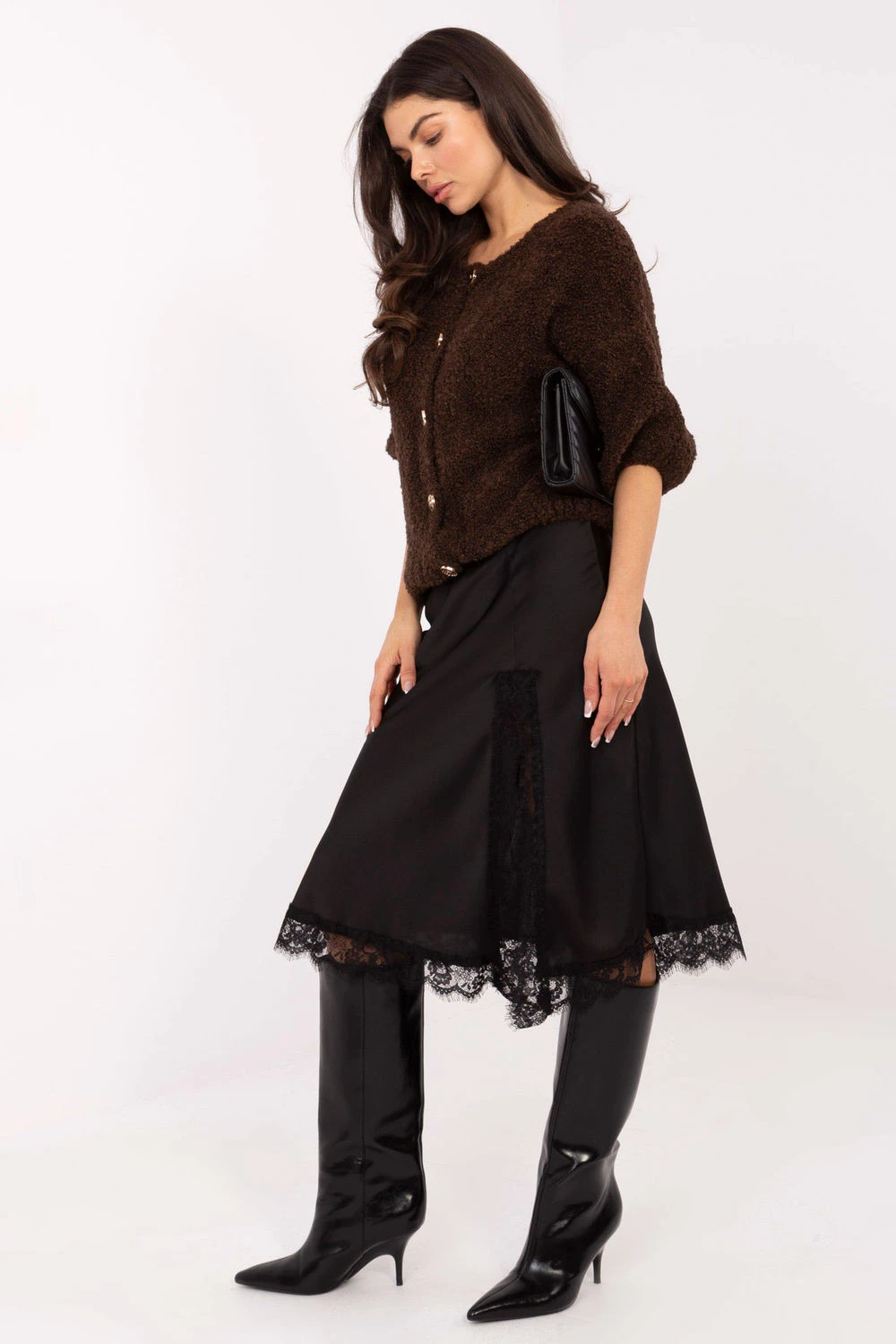 Elegantní midi sukně s klasickým ženským střihem, ideální jak do každodenního nošení, tak i na více formální příležitosti. Vyrobená z vysoce kvalitní látky s přídavkem elastanu, která jemně kopíruje postavu, poskytuje pohodlí a volnost pohybu. Model má vsazený gumový pas, díky čemuž skvěle sedí a není potřeba zapínání. Rozpark u spodní části jemně zdůrazňuje nohu, a krajkové zakončení dodává celku eleganci a jedinečný charakter. Suka v hladkém vzoru je univerzální volbou, která se skvěle hodí do práce, na schůzky a speciální příležitosti.