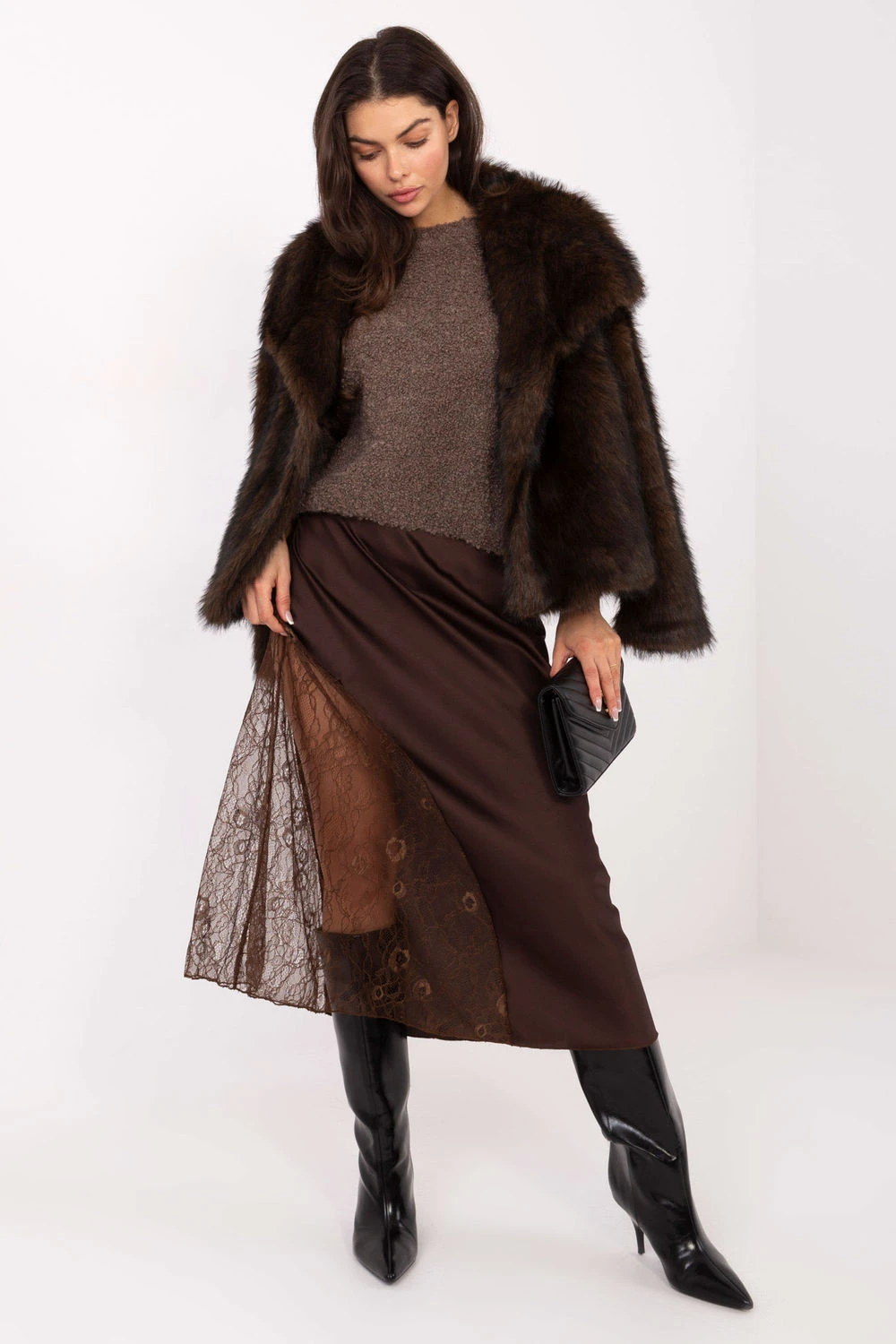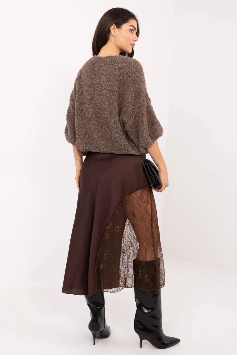 Elegantní a ženská rozkročená midi sukně je ideální kombinací elegance a pohodlí. Vyrobena z hladké látky, krásně padne na postavu, dodává jí lehkost a jemnou eleganci. V pase je vsazena elastická guma, která zajišťuje perfektní přizpůsobení a pohodlí po celý den. Bez zapínání je sukně mimořádně praktická a pohodlná k nošení. Výjimečným prvkem tohoto modelu je krajkový výstřih na levé straně, jemně zdůrazňující nohu a dodávající celku elegantní, ženský charakter. Midi délka dělá sukně ideální na různé příležitosti, od každodenních a do práce, po společenská setkání nebo večírky.