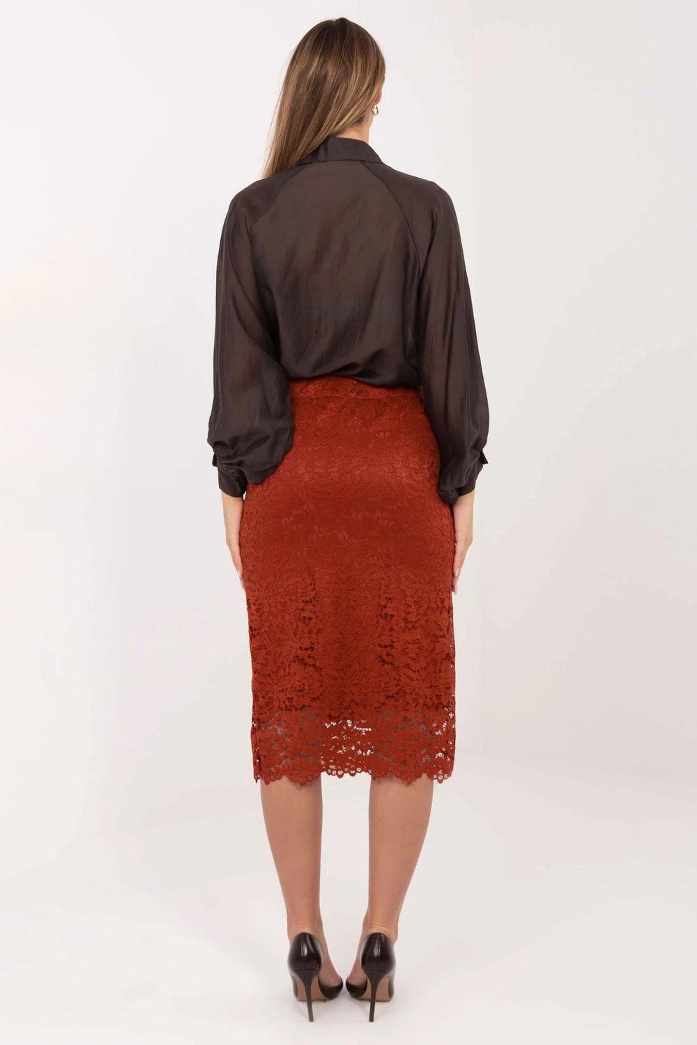 Elegantní sukně z krajkové látky je stylový návrh ideální jak do každodenního nošení, do práce, tak i na slavnostní příležitosti. Její jedinečný charakter zdůrazňuje bohatá struktura materiálu, která celku dodává jemnou, ženskou lehkost. Model midi délky vypadá velmi elegantně a univerzálně, podšívka zajišťuje pohodlné nošení a plnou volnost pohybů. V pasu je vsazena guma, díky čemuž se sukně dokonale přizpůsobí postavě a je pohodlná po celý den. Bez zapínání je velmi praktická a snadno se obléká. Jedná se o nadčasový kousek oblečení, který skvěle doplní elegantní stylizace.