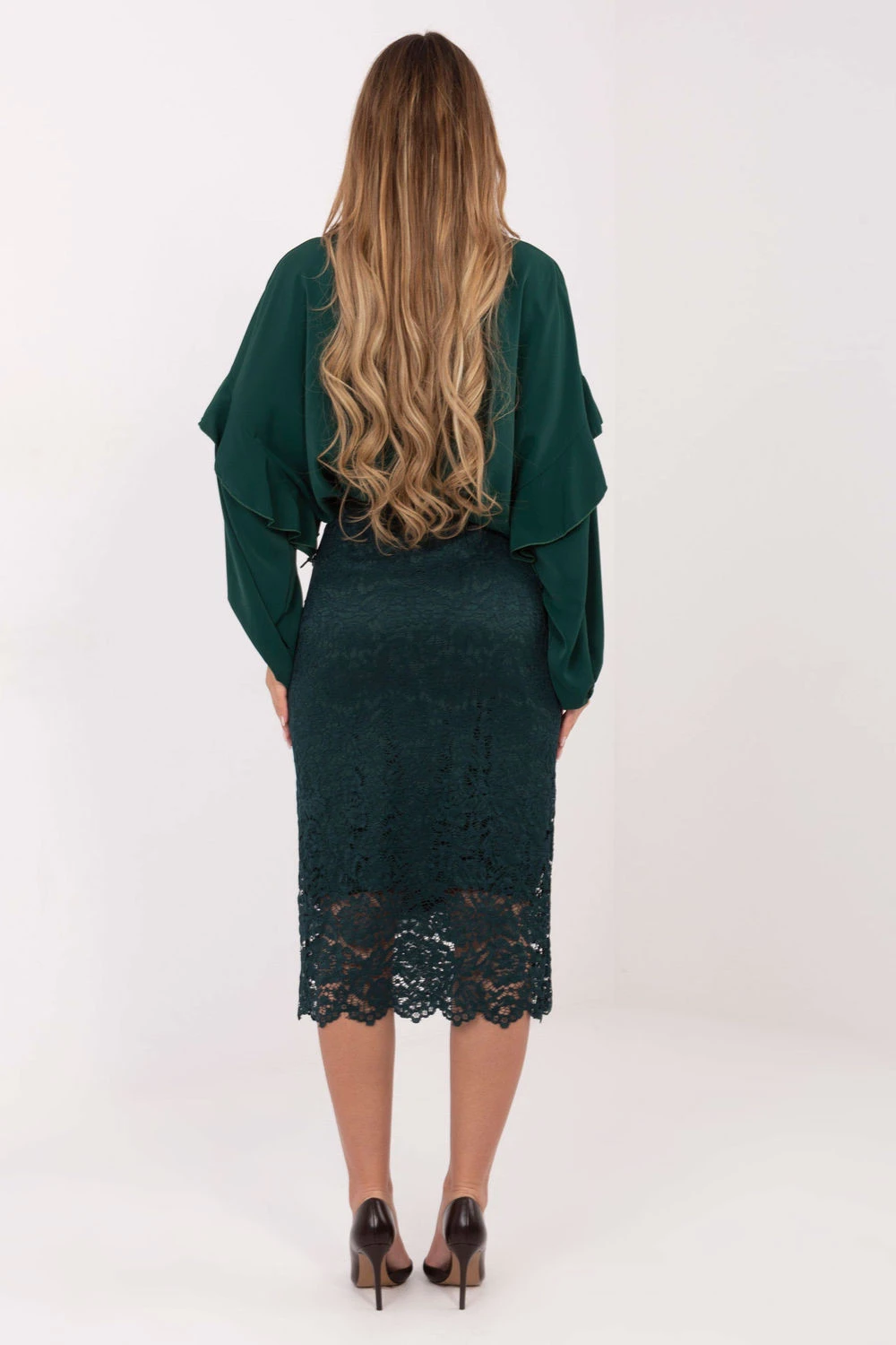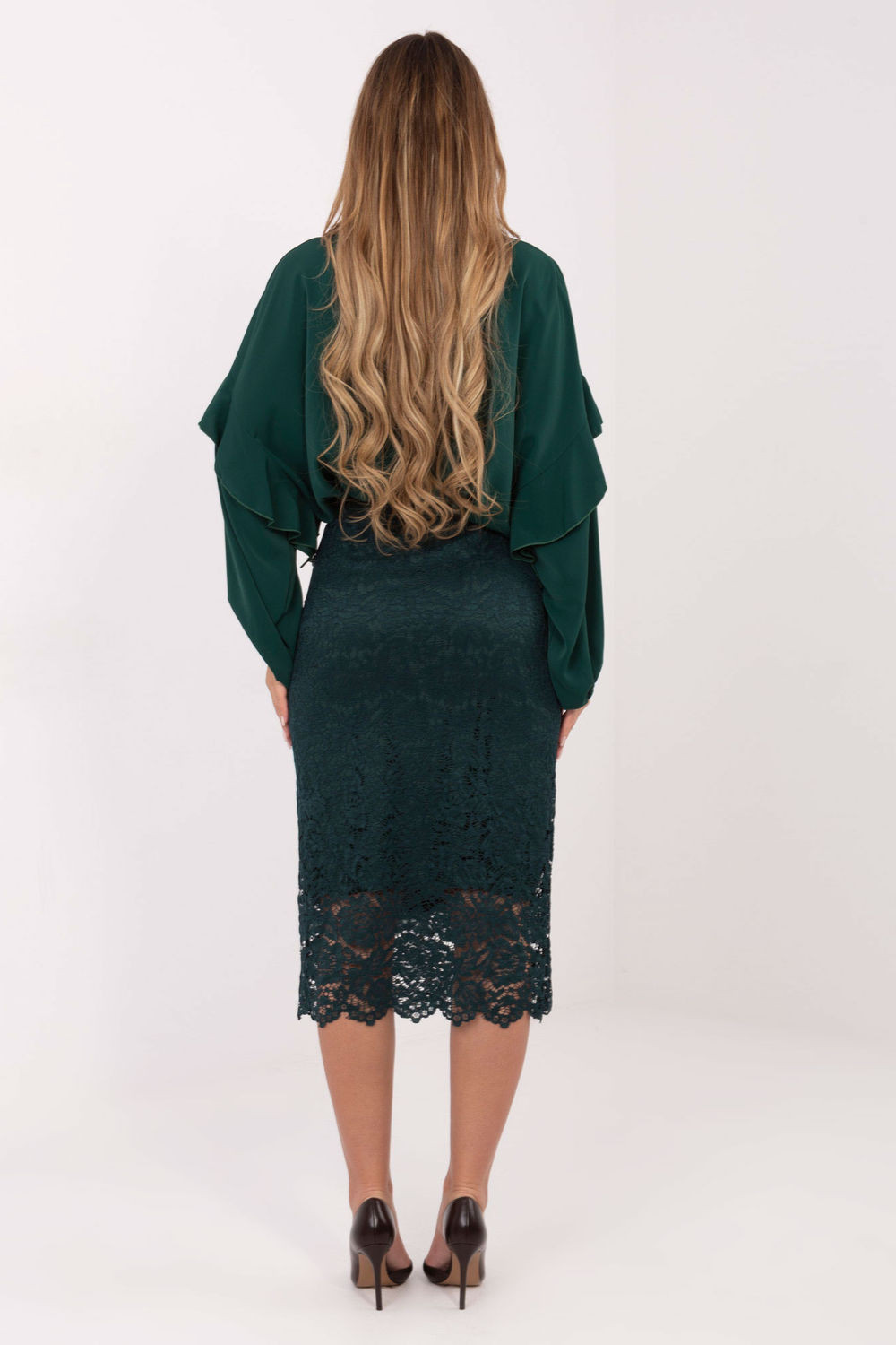 Elegantní sukně z krajky je stylový návrh ideální jak do každodenního života, do práce, tak i na formální události. Její jedinečný charakter podtrhuje různorodá struktura materiálu, která dodává celku jemnou ženskou lehkost. Model midi délky vypadá velmi elegantně a univerzálně, a podšívka zajišťuje pohodlí nošení a plnou volnost pohybů. V pasu je vsazena guma, díky čemuž se sukně skvěle přizpůsobí siluetě a je pohodlná po celý den. Bez zapínání je mimořádně praktická a snadná na oblékání. Jedná se o nadčasový kousek šatníku, který skvěle doplní elegantní stylizace.