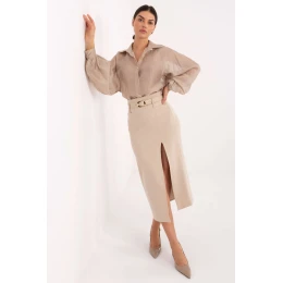 Elegantní, stylová sukně midi délky, ideální na společenské události, večírky a večerní vycházky. Vyrobená z směsi viskózy a nylonu, díky čemuž je materiál příjemný na dotek, lehce elastický a krásně padne na postavu. Dominantní hladký vzor zdůrazňuje klasický, nadčasový charakter modelu. Sukně má rozpark vpředu, který jí dodává moderní ženský akcent a zároveň zajišťuje volnost pohybu. V pase je zapínací pásek, který umožňuje ideální přizpůsobení a zdůrazňuje ženskou siluetu. Celkově je sukně zapínána na skrytý zip, zachovávajíc elegantní minimalistický vzhled.