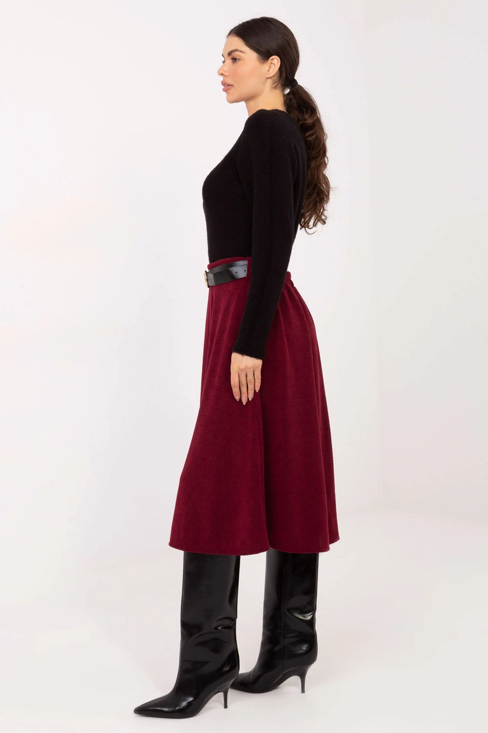 Elegantní a ženská rozkročená pletená sukně, ideální na každý den, do práce i na elegantnější příležitosti. Vyrobená z polyesteru a elastanu, poskytuje pohodlí, pružnost a krásné padání materiálu. Pletenina je pruhovaná, co dává celku výjimečnou, bohatou fakturu a jemný charakter. Sukně má délku pod koleno, díky čemu působí vkusně a klasicky. Chybějící tradiční zapínání dělá model pohodlným k nasazování a dokonale se přizpůsobuje pasu. Další výhodou je zapínací opasek, který zdůrazňuje pas a dodává elegantní dokončení. Klasická, pohodlná a ženská ideální základ pro mnoho elegantních a každodenních stylizací.