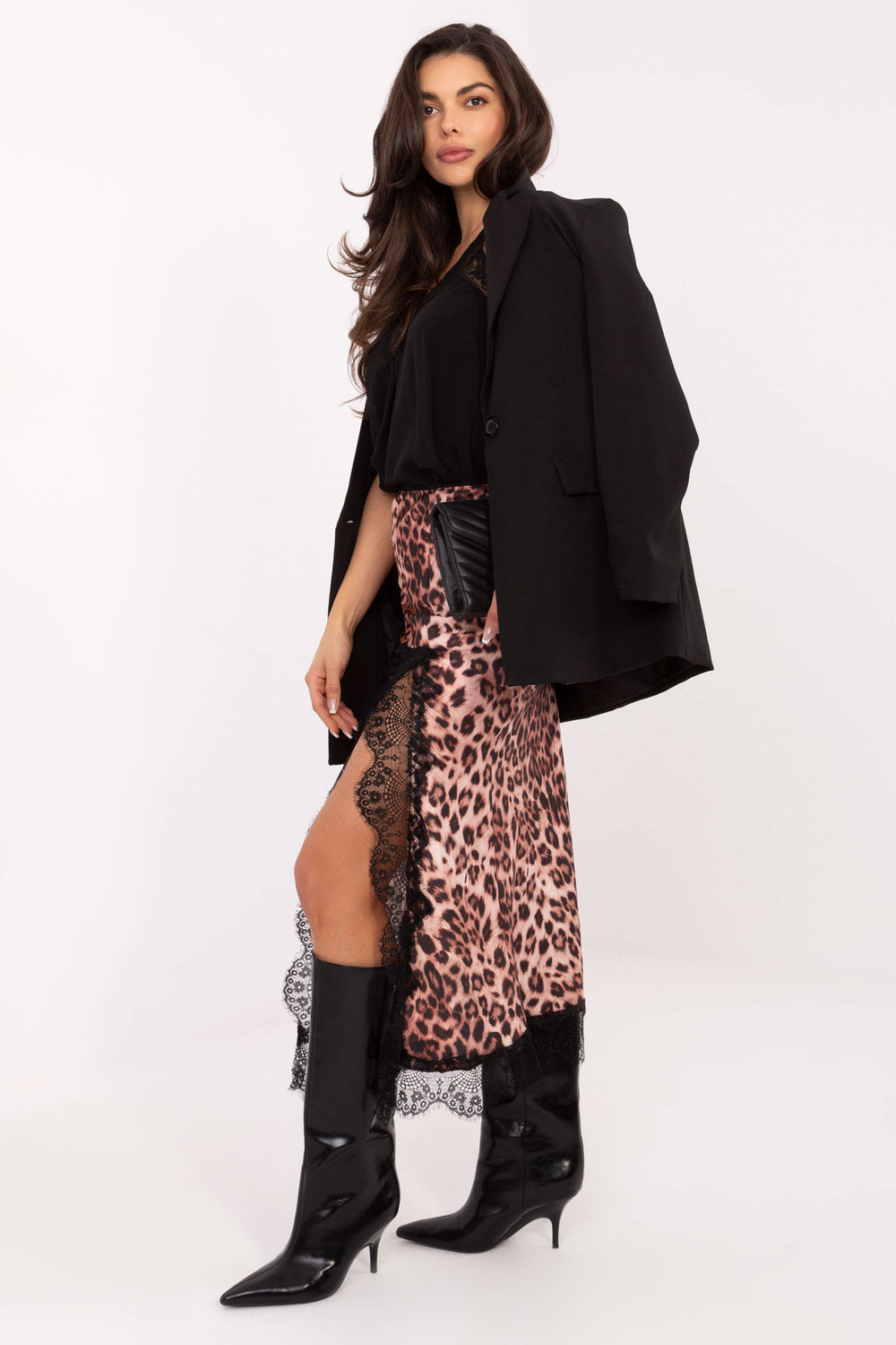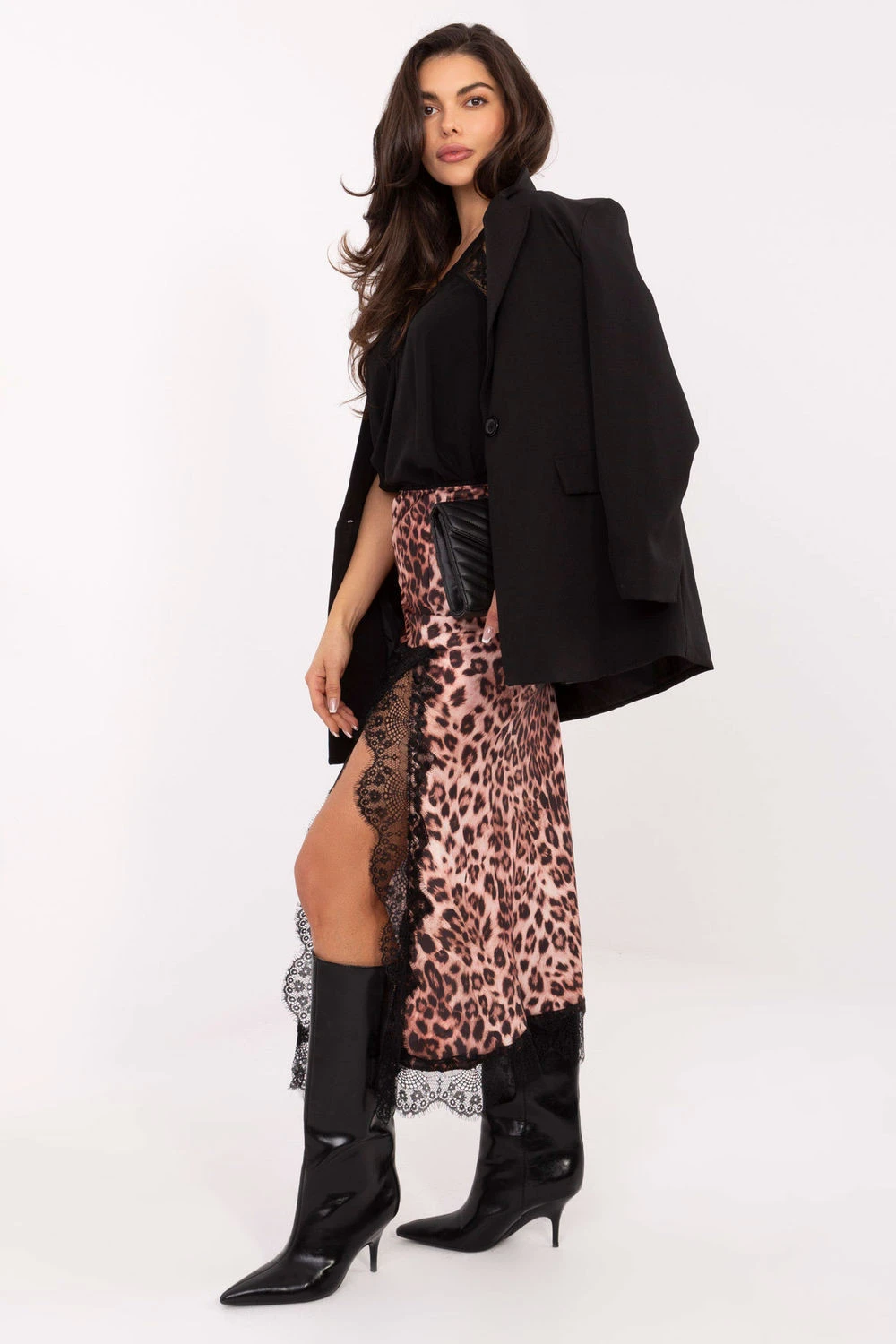 Elegantní saténová sukně je stylový návrh, který se skvěle hodí jak do každodenních stylizací, tak na příležitostné události a do práce. Efektní zvířecí motiv jí dodává výrazný, módní charakter, zdůrazňující individuální styl. Model má elastický pásek, který zajistí pohodlné nošení a ideální přizpůsobení postavě. Rozek na přední straně sahající až k noze jemně zdůrazňuje nohu, přidávajíc celku ženskou lehkost a eleganci. Celkový vzhled je dokončen jemným lemováním z krajky, které představuje výjimečný, dekorativní akcent. Sukně je vyrobena z vysoké kvality směsi polyesteru, viskózy a elastanu, díky čemuž je materiál lehký, příjemný na dotek a jemně elastický. Absence zapínání zdůrazňuje minimalistický tvar a pohodlí při nošení.