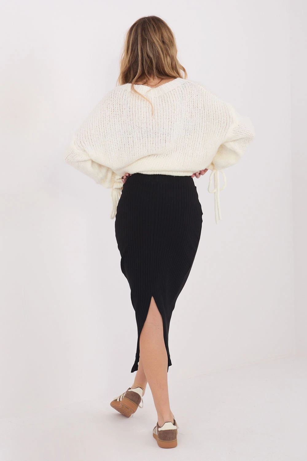 Sukně z pleteniny midi délky, vyrobená z měkkého pruhovaného materiálu, který zaručuje vysoký komfort nošení. Model v casual stylu se skvěle hodí jak do každodenních outfitů, tak i jako součást pracovního oblečení. Hladký vzor jí dodává univerzální charakter a usnadňuje kombinování s různými střihy blůz nebo svetrů. Na zádech dole má praktický rozpark, který zvýrazňuje postavu a zajišťuje volnost pohybu. Sukně je vyrobena z bavlny s přídavkem elastanu, díky čemuž je elastická, příjemná na dotek a dobře se přizpůsobuje postavě. Absence zapínání zdůrazňuje jednoduchý, pohodlný střih modelu.