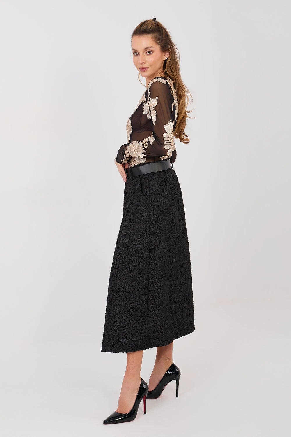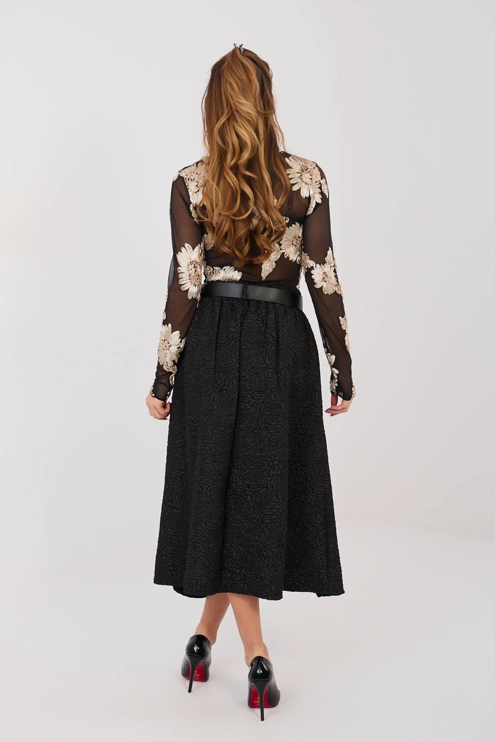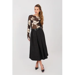 Ta rozšířená midi sukně je skvělým návrhem pro ženy, které ocení eleganci spojenou s pohodlím nošení. Klasický střih se krásně tvaruje podle postavy, zdůrazňuje pas a dodává lehkost každému pohybu. V pasu je vsazena elastická guma, která zajišťuje pohodlné přizpůsobení, aniž by bylo zapotřebí zapínání. Dekorativní lícové záhyby vpředu dodávají sukně výjimečný charakter a jemný objem, zatímco různorodá struktura materiálu a jemný květinový vzor přináší nádech ženské elegance. Model se skvěle hodí jak do elegantních stylizací, tak k práci s košilí, halenkou nebo sako. Další výhodou jsou praktické kapsy a zapínací pásek, který pomáhá zdůraznit pas a dodat celkovému vzhledu dokonalost. Tato sukně spojuje klasickou eleganci s každodenním pohodlím. Ideální do kanceláře, na schůzky a slavnostní příležitosti - vždy, když chcete vypadat stylově a cítit se pohodlně.