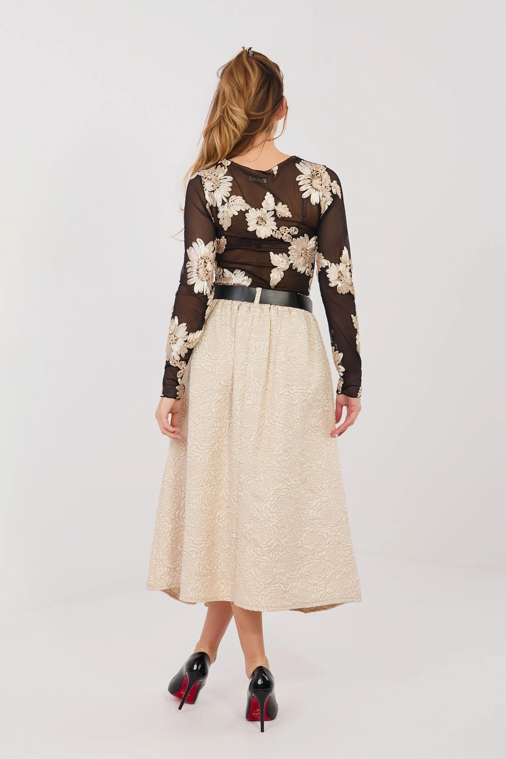 Tato rozšířená střední sukně je skvělým návrhem pro ženy, které ocení eleganci spojenou s pohodlím nošení. Klasický střih krásně padne na postavě, zdůrazňuje pas a dodává lehkost každému pohybu. V pase je vsazena elastická guma pro pohodlné přizpůsobení bez nutnosti zapínání. Dekorativní záhyby vpředu dodávají sukní zvláštní charakter a jemný květinový vzor a různorodá struktura materiálu vnášejí do oblečení nádech ženské elegance. Model se skvěle hodí jak do společenských stylizací, tak i do práce s košilí, blůzou nebo sako. Další výhodou jsou praktické kapsy a zapínací pásek, který zdůrazní pas a dodá celku propracovaný vzhled. Jedná se o sukně, která spojuje klasickou eleganci s každodenním pohodlím. Ideální do kanceláře, na setkání a slavnostní příležitosti vždy, kdy chcete vypadat stylově a cítit se pohodlně.
