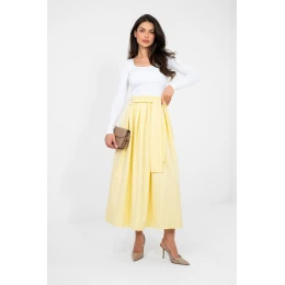Elegantní midi sukně s rozšířeným střihem je skvělou volbou pro ženy, které ocení klasiku s nádechem modernosti. Model s vysokým pasem krásně zdůrazňuje pas, a gumový pásek v pase zajišťuje ideální přizpůsobení a pohodlí po celý den. Sukně je vyrobena z pruhovaného materiálu, který jí dodává stylový charakter a opticky zúží postavu. Součástí je přišitý pásek na vázání, který ještě lépe zdůrazní pas a dodá stylizaci individuální výraz. Praktické kapsy zvyšují funkcionalitu modelu. Vyrobená z kombinace polyesteru, viskózy a elastanu spojuje odolnost s měkkostí a pružností, zaručující pohodlí a elegantní vzhled jak v kancelářských stylizacích, tak na speciální příležitosti.