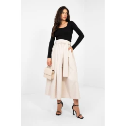 Elegantní midi sukně s rozšířeným střihem je skvělou volbou pro ženy, které oceňují klasiku s nádechem modernosti. Model s vysokým pasem krásně zdůrazňuje pas a gumový pás zaručuje ideální přizpůsobení a pohodlí po celý den. Sukně je vyrobena z pruhované látky, která jí dodává stylový charakter a opticky zúžuje postavu. Součástí je přišitý pásek k zavázání, který ještě lépe zdůrazní pas a dodá stylizaci individuální výraz. Praktické kapsy zvyšují funkčnost modelu. Vyrobená z kombinace polyesteru, viskózy a elastanu spojuje trvanlivost s měkkostí a pružností, zaručující pohodlí a elegantní vzhled jak v kancelářských stylizacích, tak na speciální příležitosti.