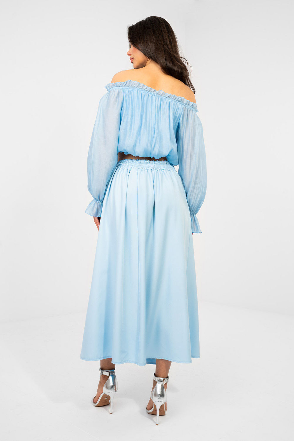 Tato elegantní midi sukně je ideální kombinací klasiky a pohodlí, skvělá na každodenní nošení, do práce nebo na formální události. Vyrobená z vysoce kvalitní směsi polyesteru a elastanu zajišťuje pohodlí nošení, odolnost a krásné padání materiálu. Model s hladkou strukturou je zdoben předními záhyby, které dodávají lehkost a ženský charakter. Na zádech je vsazena guma, díky které se sukně dokonale přizpůsobí postavě a zaručí pohodlí po celý den. Další výhodou jsou boční kapsy a ozdobný knoflík, jemně zdůrazňující elegantní styl modelu. Bez zapínání je sukně mimořádně praktická a snadno se obléká. Jedná se o univerzální kus šatníku, který se skvěle hodí jak do kancelářských outfitů, tak i na formální události.