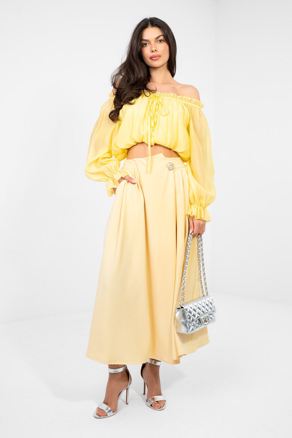 Tato elegantní midi sukně je ideální kombinací klasiky a pohodlí, skvělá na každodenní nošení, do práce nebo na více formální události. Vyrobená z vysoce kvalitní směsi polyesteru a elastanu poskytuje pohodlí při nošení, trvanlivost a krásné padání materiálu. Model s hladkou strukturou se vyznačuje zepředu plisovaným lemem, který dodává lehkost a ženský charakter. Na zádech je vsazena guma, díky které se sukně perfektně přizpůsobí postavě a poskytuje pohodlí po celý den. Další výhodou jsou boční kapsy a ozdobné knoflíčky, jemně zdůrazňující elegantní styl modelu. Bez zapínání je sukně mimořádně praktická a snadná na nasazení. Jedná se o univerzální kousek šatníku, který se skvěle hodí jak do kancelářských outfitů, tak i na formální události.
