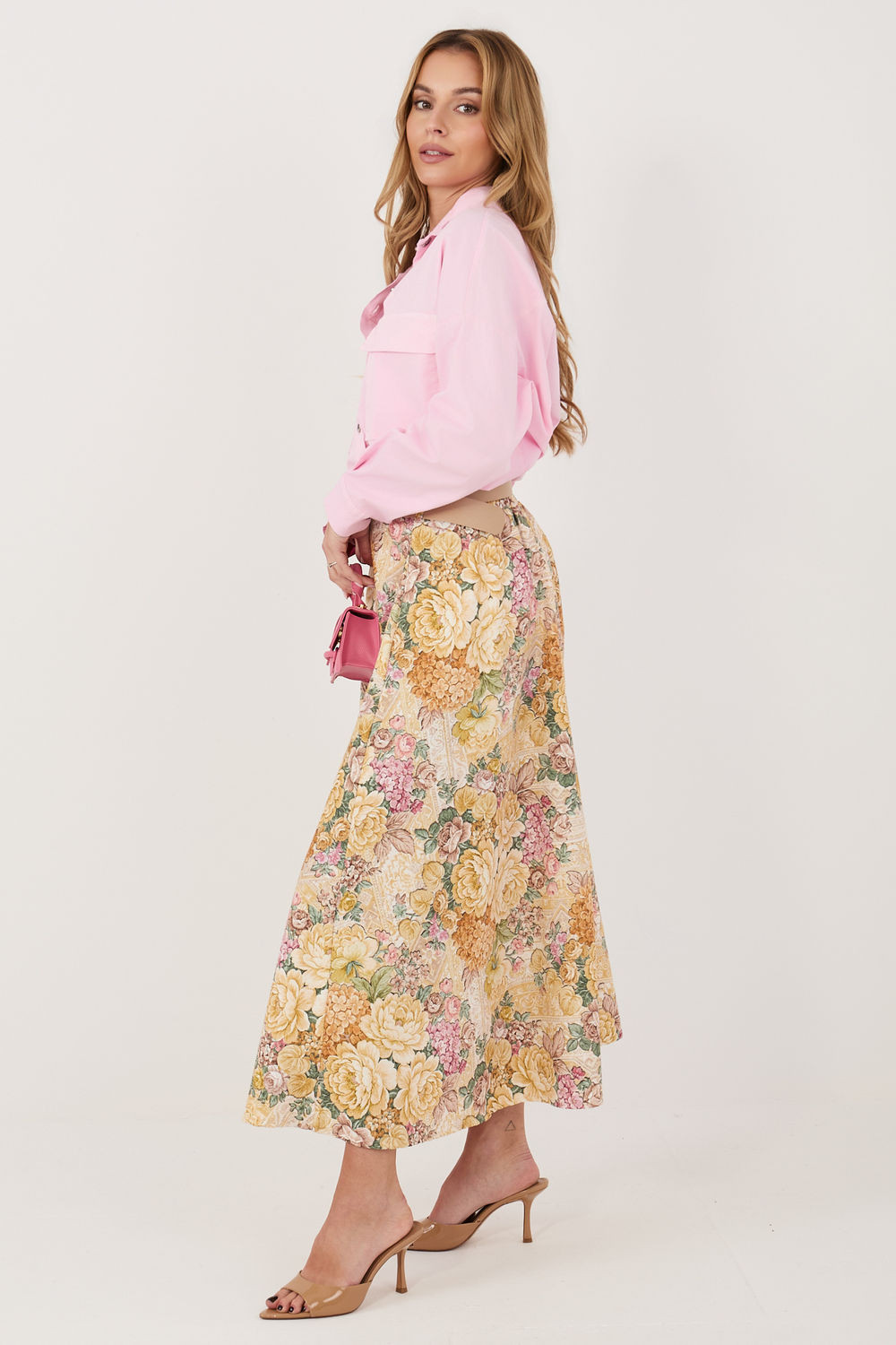 Elegantní midi sukně s elegantním a zároveň univerzálním charakterem. Skvěle se hodí jak do pracovních stylizací, na schůzky, tak i každodenní nošení. Model se vyznačuje módním květinovým potiskem, který dodává lehkost a ženský šarm. Vyrobený z vysoce kvalitní směsi polyesteru s přídavkem elastanu poskytuje pohodlí a volnost pohybu. Sukně nemá klasické zapínání, v pasu vzadu je vsazena elastická guma, která se přizpůsobí postavě a zajišťuje pohodlí po celý den. Dalším prvkem je zapínací pásek, který zdůrazňuje pas a dodává celku elegantní dokončení. Midi délka dělá model velmi stylovým a hodí se do mnoha příležitostí. Ideální k kombinaci jak s košilí a sako, tak s lehkým topem nebo svetrem.