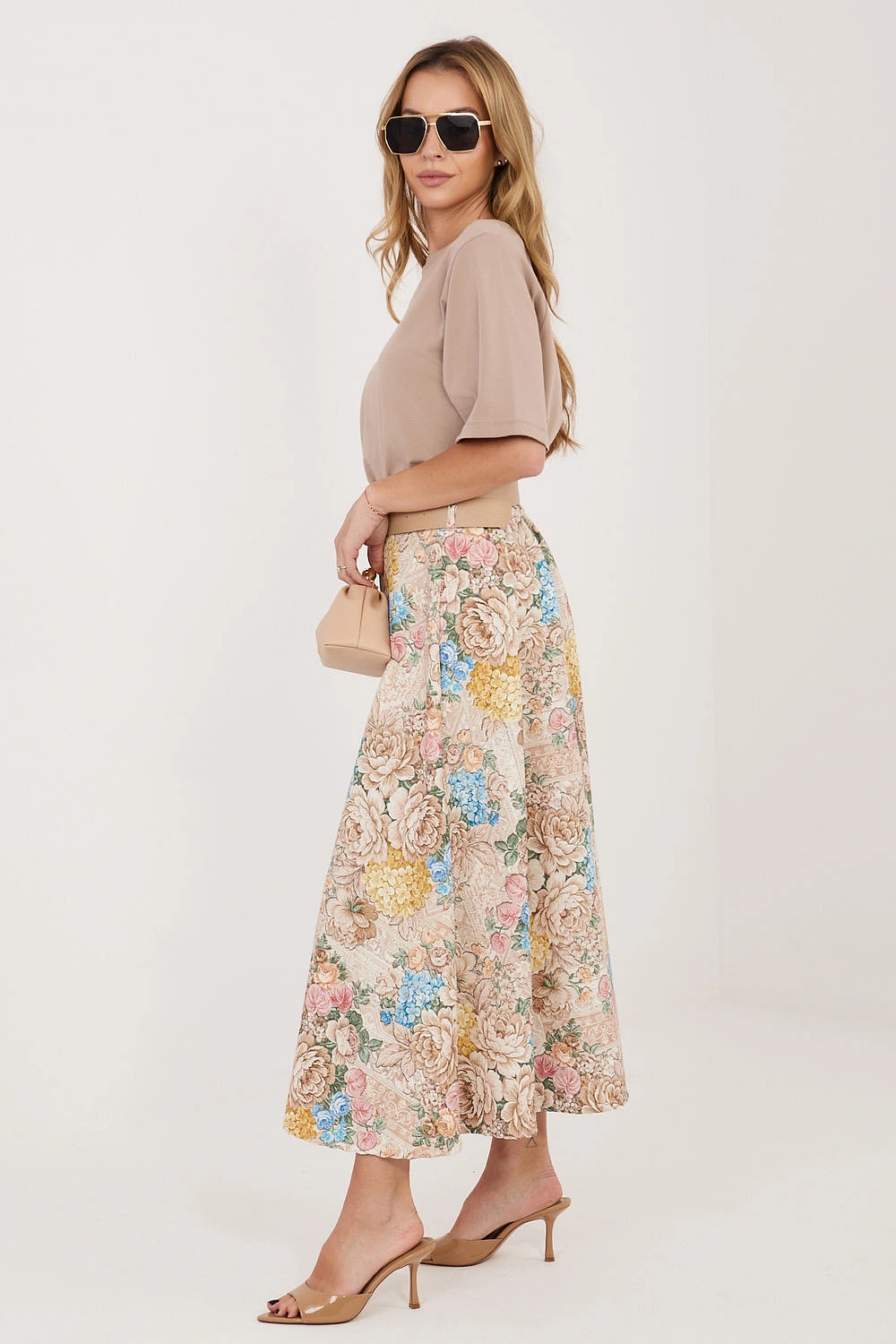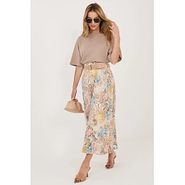 Elegantní midi sukně s elegantní, ale zároveň univerzální povahou. Skvěle se hodí jak do pracovních stylizací, na pracovní schůzky, tak i na každodenní nošení. Model je zdoben moderním květinovým potiskem, který dodává lehkost a ženský šarm. Vyrobená z vysoké kvality polyesterové směsi s přídavkem elastanu, poskytuje pohodlí a volnost pohybu. Sukně nemá klasické zapínání, vzadu v pasu je vsazena elastická guma, která se přizpůsobí postavě a zaručuje pohodlí po celý den. Dalším prvkem je zapínací pásek, který zdůrazňuje pas a dodává celku elegantní finiš. Délka midi dělá tento model velmi stylovým a vhodným do mnoha příležitostí. Ideální k kombinaci jak s košilí a sako, tak s lehkým topem nebo svetrem.