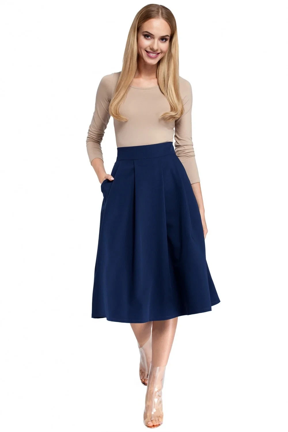 Mírně rozšířená sukně ke kolenům s tvarujícími záhyby je ženským a stylovým kouskem šatníku. Boční kapsy dodávají střihu na objemu a rozhodně jsou také pohodlné.