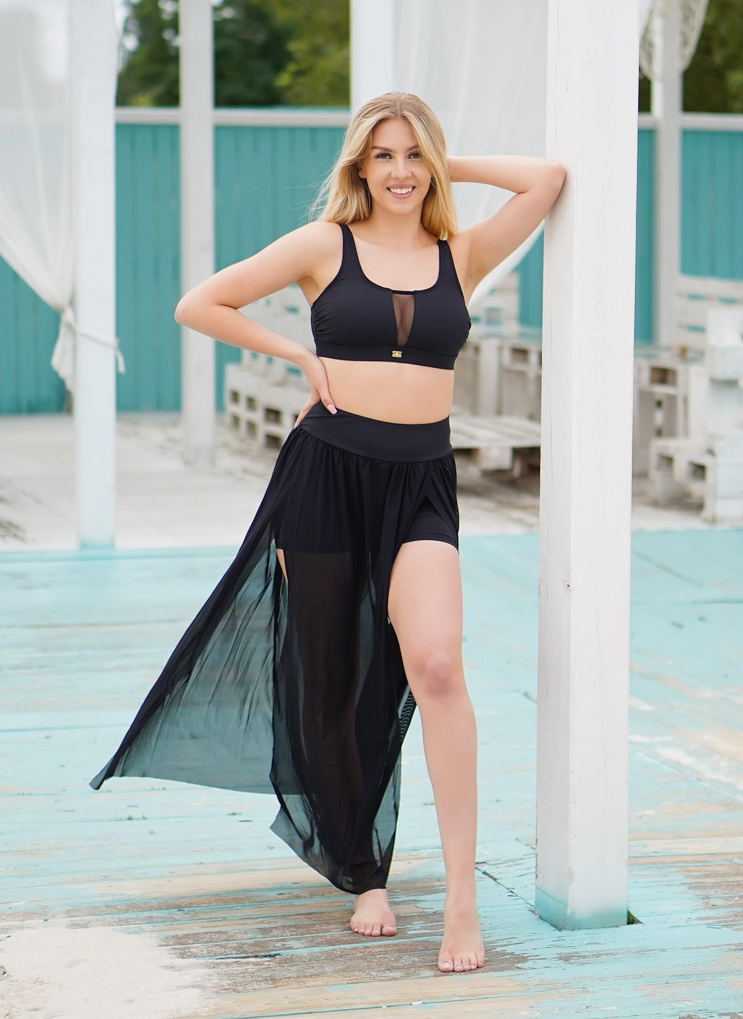 Neobvyklý model kombinující sukni z jemné, vzdušné a ozdobné síťoviny s krátkými šortkami pro pohodlí a volnost pohybu