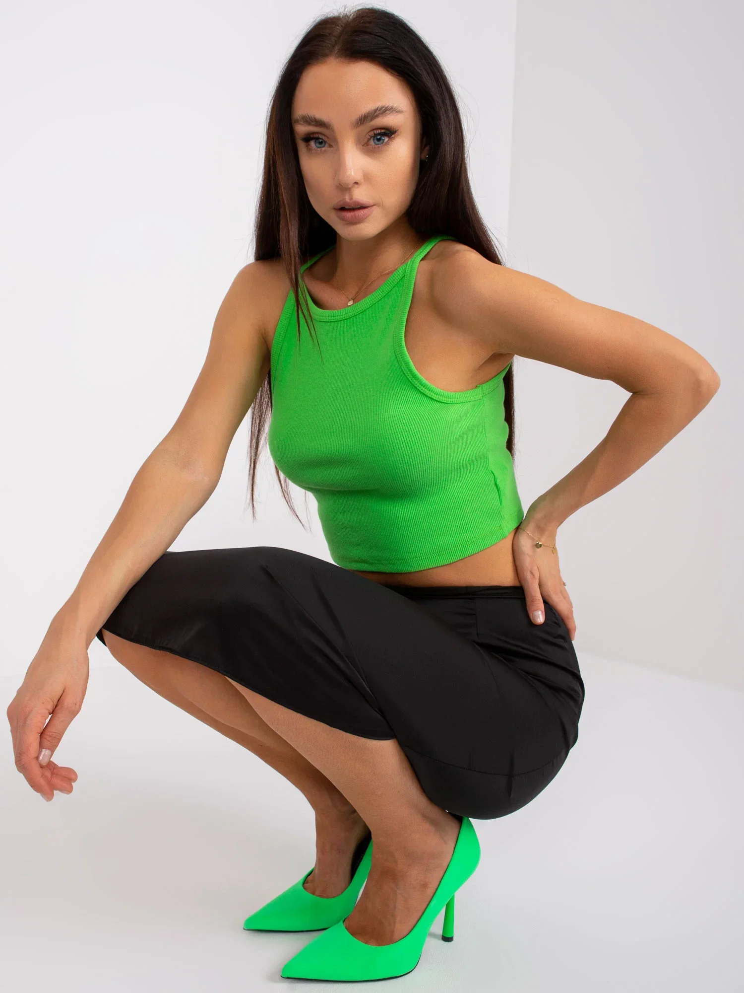Modelka má na sobě velikost S. Rozměry modelky: výška 171 cm, poprsí 84 cm, pas 60 cm, boky 88 cm.