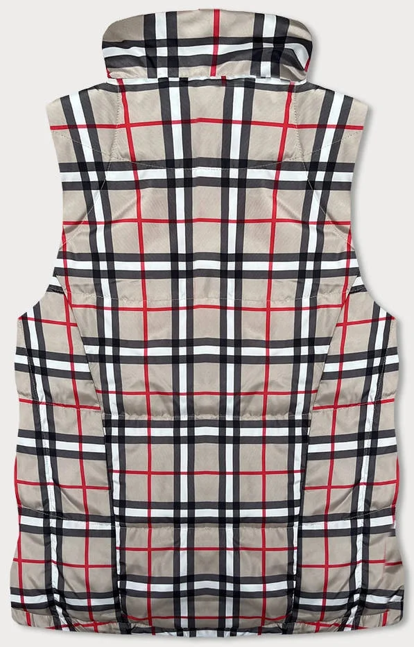 Jedna strana vesty je hladká a druhá je ozdobená károvaným vzorem burberry. Model má volný trapézový střih, stojáček, dvě kapsy bez zapínání a zapíná se zipem. Vesta má délku k bokům. Spodní okraj modelu je půlkulatý a přední část vesty je o něco kratší než zadní.