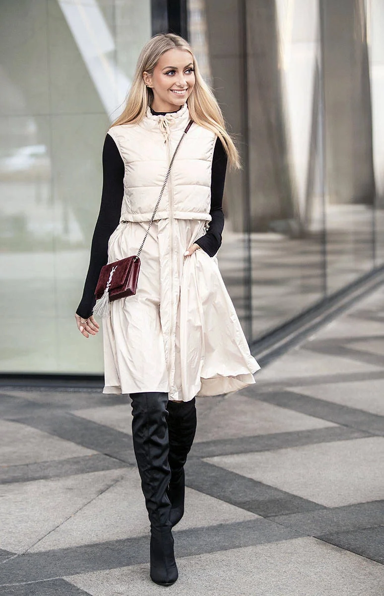 Vesta je lehce zateplená syntetickou péřovou výplní a má délku nad kolena. Model má stojáček, dvě kapsy a zapíná se dvousměrným zipem. V pase modelu jsou stahující gumičky. Vrchní část vesty je vypasovaná a spodní část je ušitá ze vzdušného materiálu.