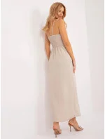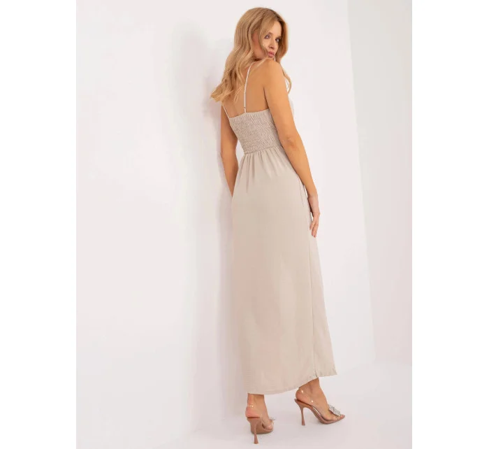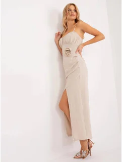 Světle béžové dámské koktejlové šaty s rozparkem (18992)