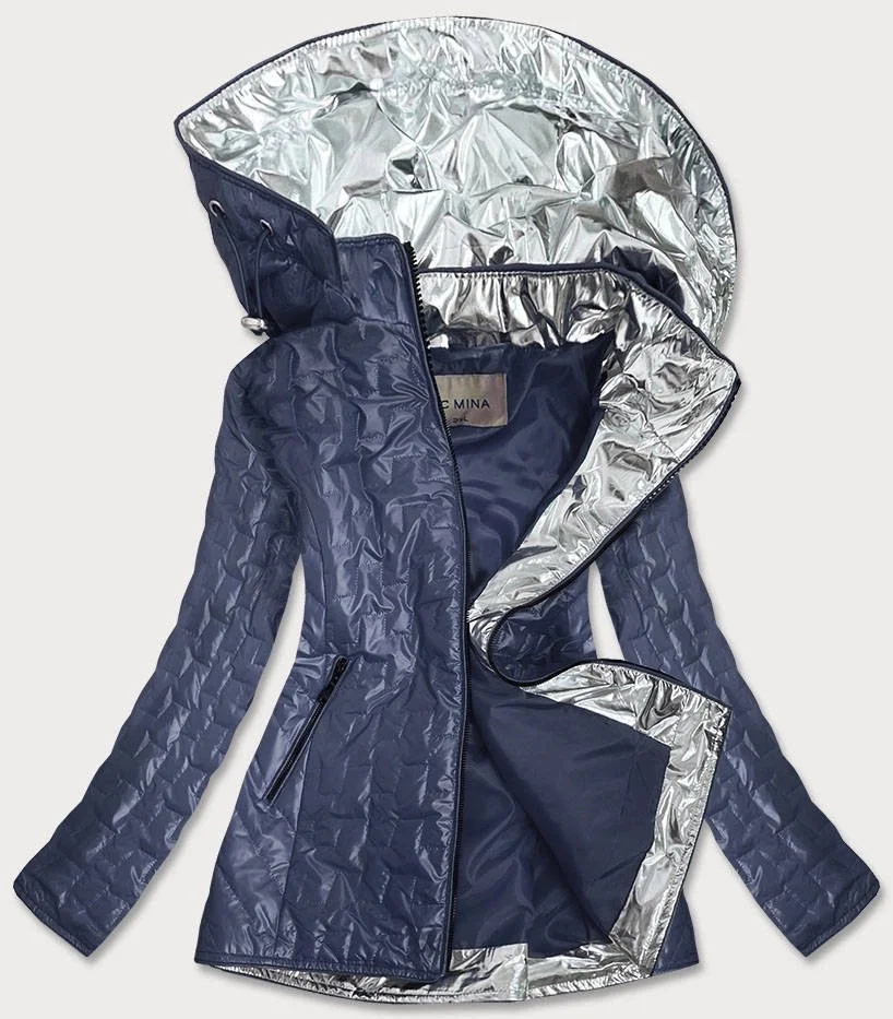 Model zdobí lesklé stříbrné vsadky v kapuci, podél zipu a na manžetách. Bunda je vypasovaná a je zateplená tenkou vrstvou syntetické péřové výplně. Model má kapuci, kterou je možné odepnout. Vzadu je v pase stahující guma. Bunda se zapíná zipem a má dvě kapsy. Model má délku do poloviny stehen.