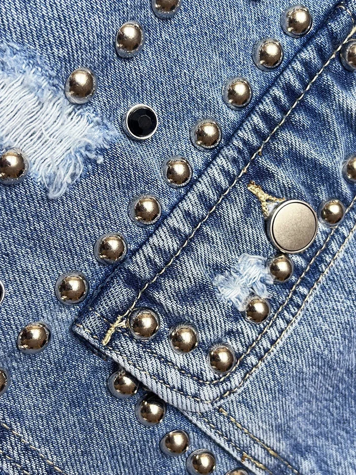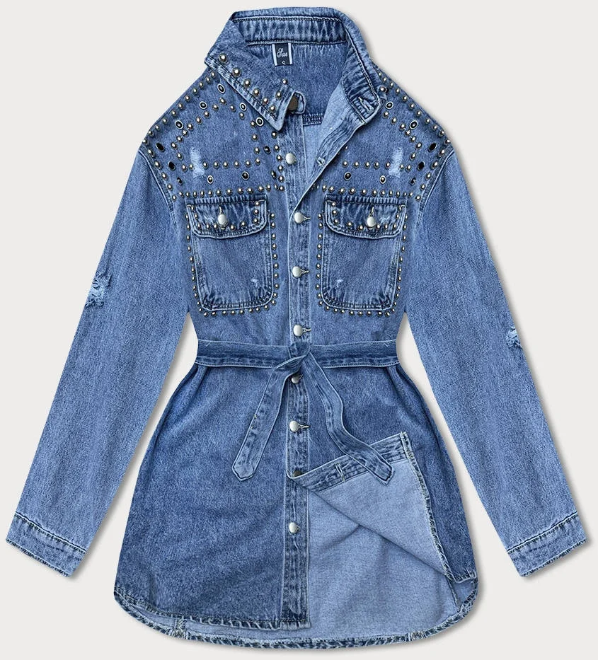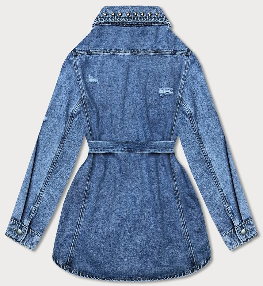 Bunda má límeček, dvě kapsy a zapíná se knoflíky. Model je ozdobený lesklými kamínky a protrženími. V pase modelu je pásek pro zavazování. Bunda se směrem dolů zužuje a má délku do poloviny stehen.